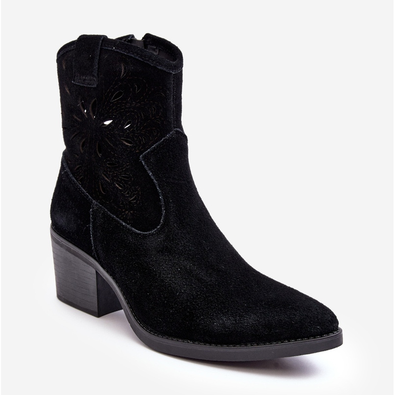 Des bottes de cowboy féminines élégantes en cuir en daim naturel, décorée d'un motif ouvert dans toute la tige. Le modèle combine un look féminin avec un talon confortable et stable comme un poteau (hauteur 6 cm). Fixé avec un curseur de côté, avec un orteil pointé clairement allongé qui a optiquement mince la jambe. Parfait pour le printemps, l'été et l'automne - pas d'isolation.