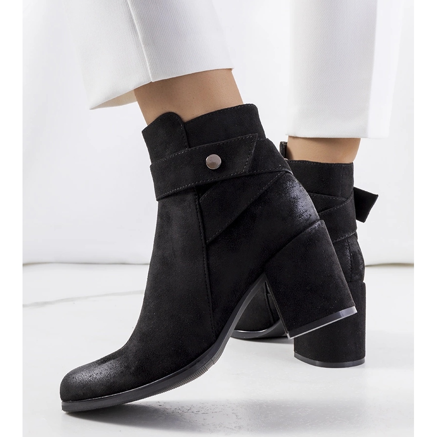 Boots Black Craydon - Élégant et confortable pour les jours plus frais. La tige asymétrique atteignant la cheville, légèrement allongée à l'avant, crée un accent à la mode dans les stylisations de tous les jours. Fabriqué en ekozamsz, avec un réchauffement délicat (couverture de chaussures), ils offriront du confort et de la protection contre le froid. La bande décorative d'eco-heather à la cheville avec l'imitation d'un verrou en argent ajoute du caractère, et la fixation de zip pratique le rend plus facile à insérer. Un piston stable avec une hauteur de 7,5 cm modélise bien la figure, sans abandonner le confort.