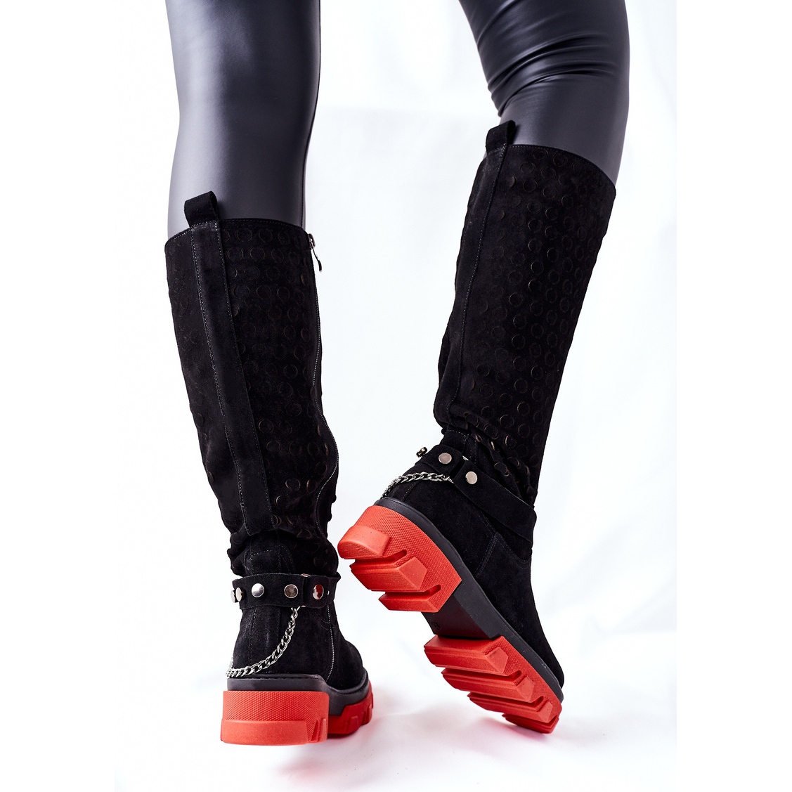 Élégant et expressif en même temps - ces bottes sont un incontournable dans la garde-robe d'une femme qui aime un accent fort et à la mode. Entièrement en daim naturel, ils combinent une coupe classique avec un détail rocheux: une chaîne décorative et une sangle avec des rivets qui peuvent être détachés, adaptant l'apparence à l'occasion.