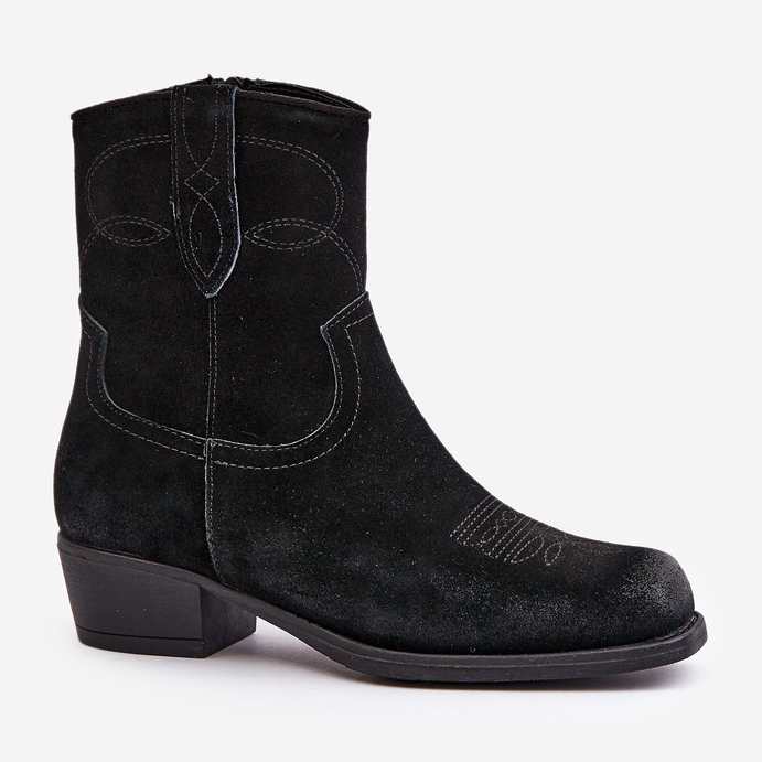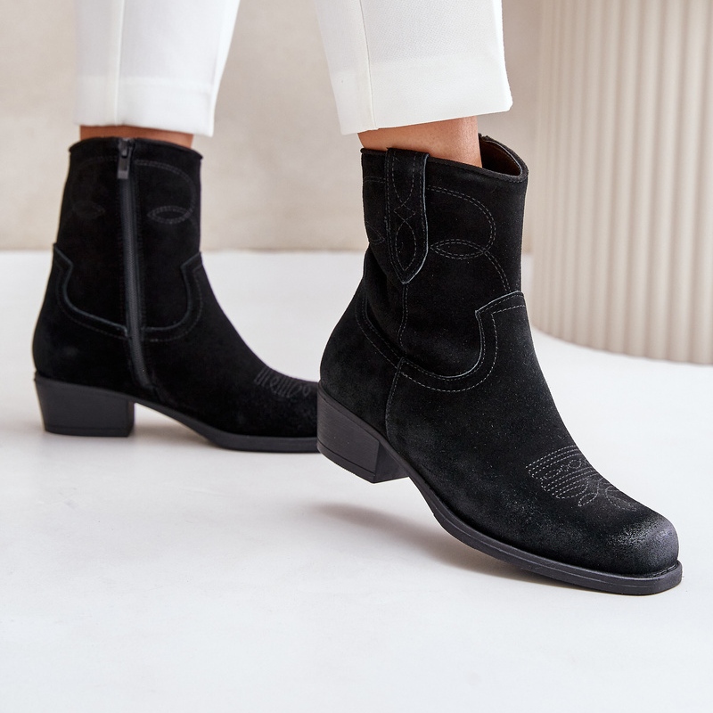 Des bottes en daim avec des bottes de cowboy féminines à talons bas Sergio Leone BT284-S en noir sont une excellente proposition pour toutes les fashionistas qui veulent combiner le style avec le confort. Ces chaussures élégantes sont en daim naturel, ce qui leur donne non seulement un look attrayant, mais aussi de haute qualité. Isulées avec une belle couverture de chaussures, ils fournissent de la chaleur même les jours plus frais, ce qui en fait le choix parfait pour l'automne et l'hiver.