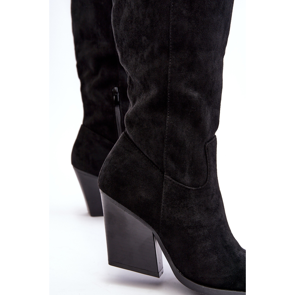 La tige, de 38,5 cm de hauteur et 18 cm de largeur, assure confort de port et aspect esthétique. L'intérieur des bottes n'est pas isolé et l'insert est en tissu. Les bottes en daim sont unicolores - noires, tout comme la semelle en plastique. Le design de la chaussure se caractérise par un talon raidi et un bout pointu.