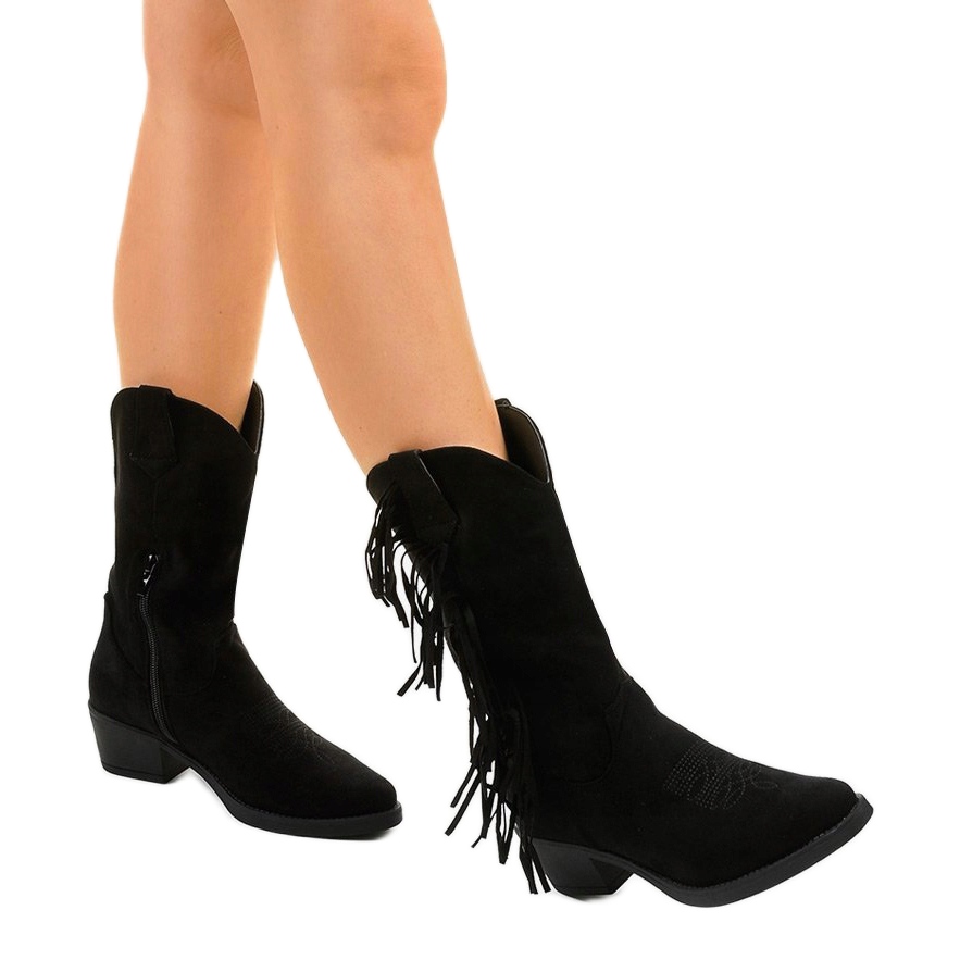 Des ajouts intéressants sous forme de franges noires confèrent aux chaussures un caractère original, et le talon haut en forme de bloc (5 cm) assure la stabilité au porté. Grâce à la hauteur supérieure appropriée, qui atteint jusqu'à mi-mollet (31 cm), ces bottes santiags se marient parfaitement aussi bien avec des jeans qu'avec des robes aériennes.