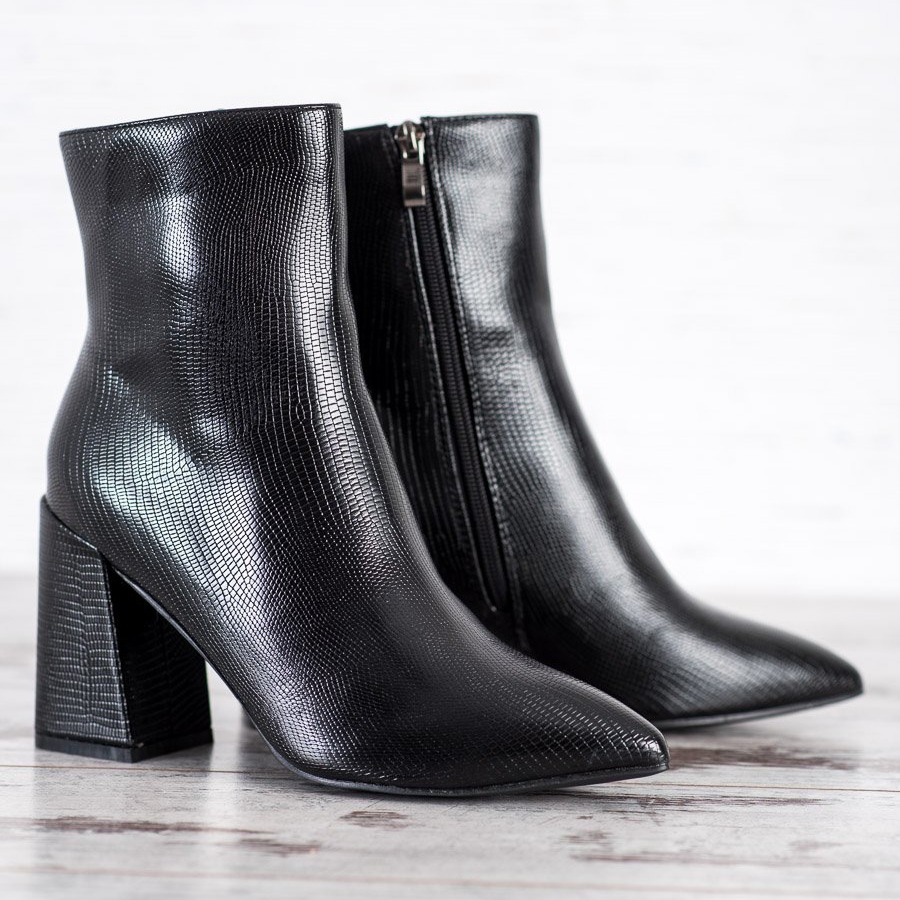 Une isolation intérieure agréable assure un confort thermique même par temps froid, et le talon bloc haut de 9 cm affine la silhouette et allonge optiquement les jambes. La fermeture éclair facilite l'enfilage et le retrait, ce qui rend les bottes extrêmement pratiques. La semelle synthétique lisse et le talon renforcé offrent stabilité et confort, ce qui est extrêmement important pour un usage quotidien.