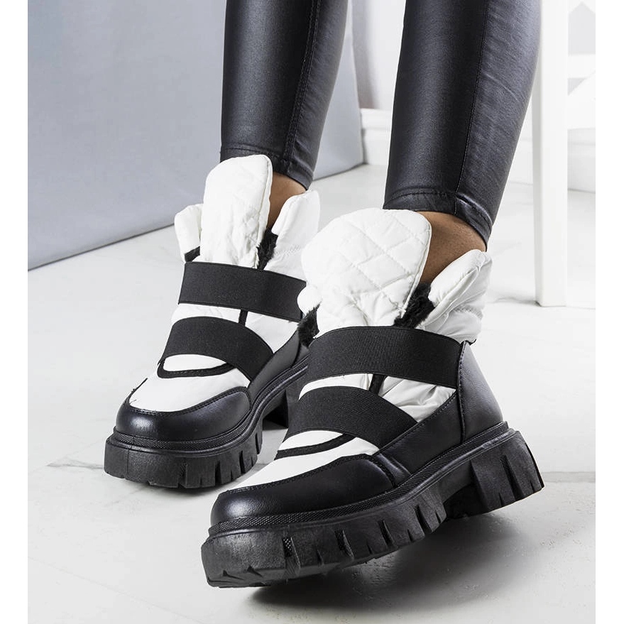 Des bottes de neige pratiques et à la mode - parfaites pour les jours froids. La structure coulissante et la fourrure épaisse garantissent la chaleur et le confort, et la plate-forme haute, 5 cm et la semelle en caoutchouc isolant à partir d'un sol froid et assurent le confort à chaque étape. La semelle noire contrastée met l'accent sur l'apparence moderne et minimaliste en blanc / noir.
