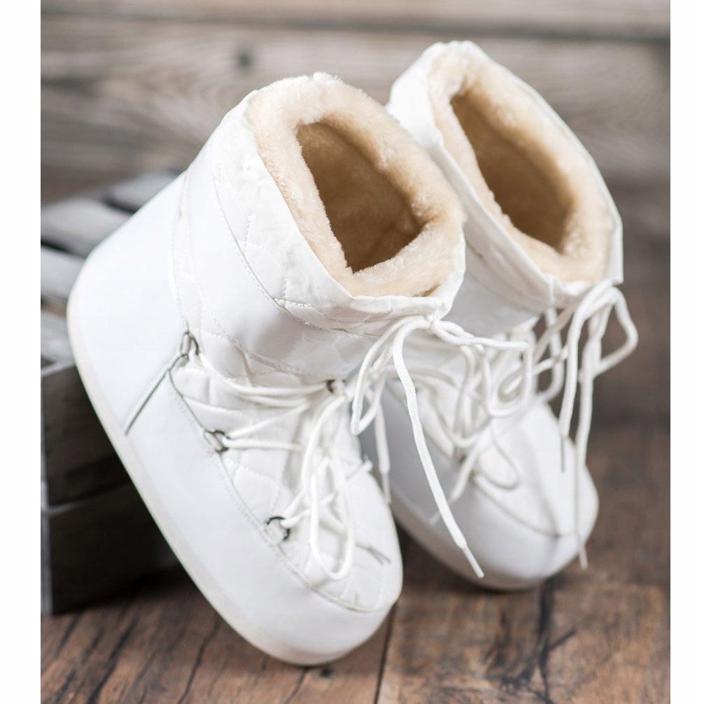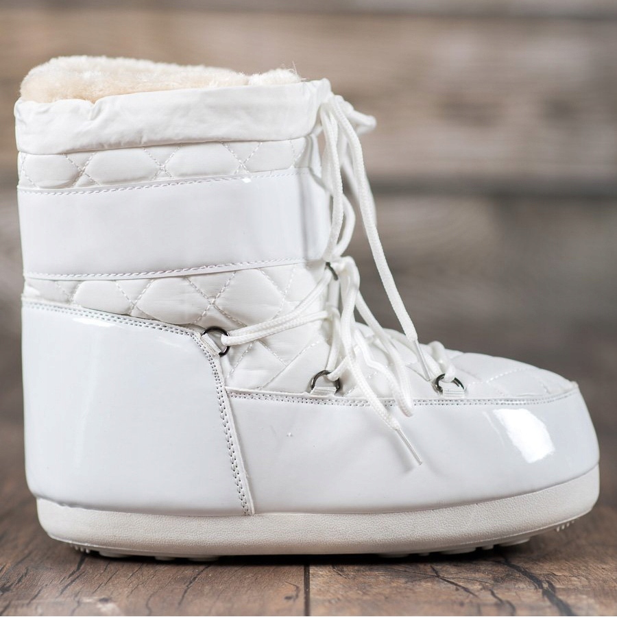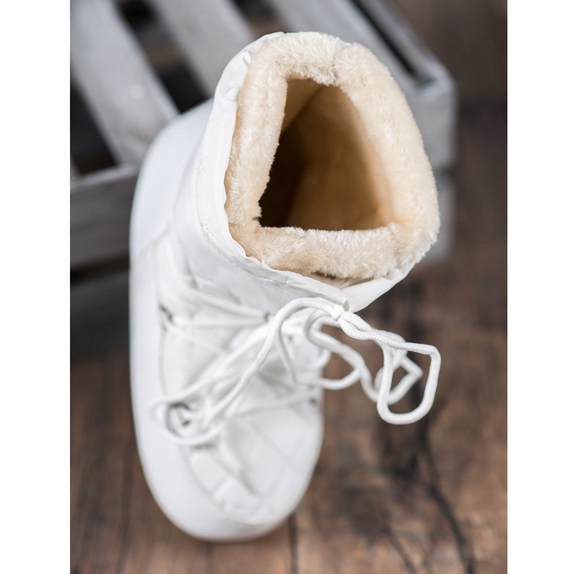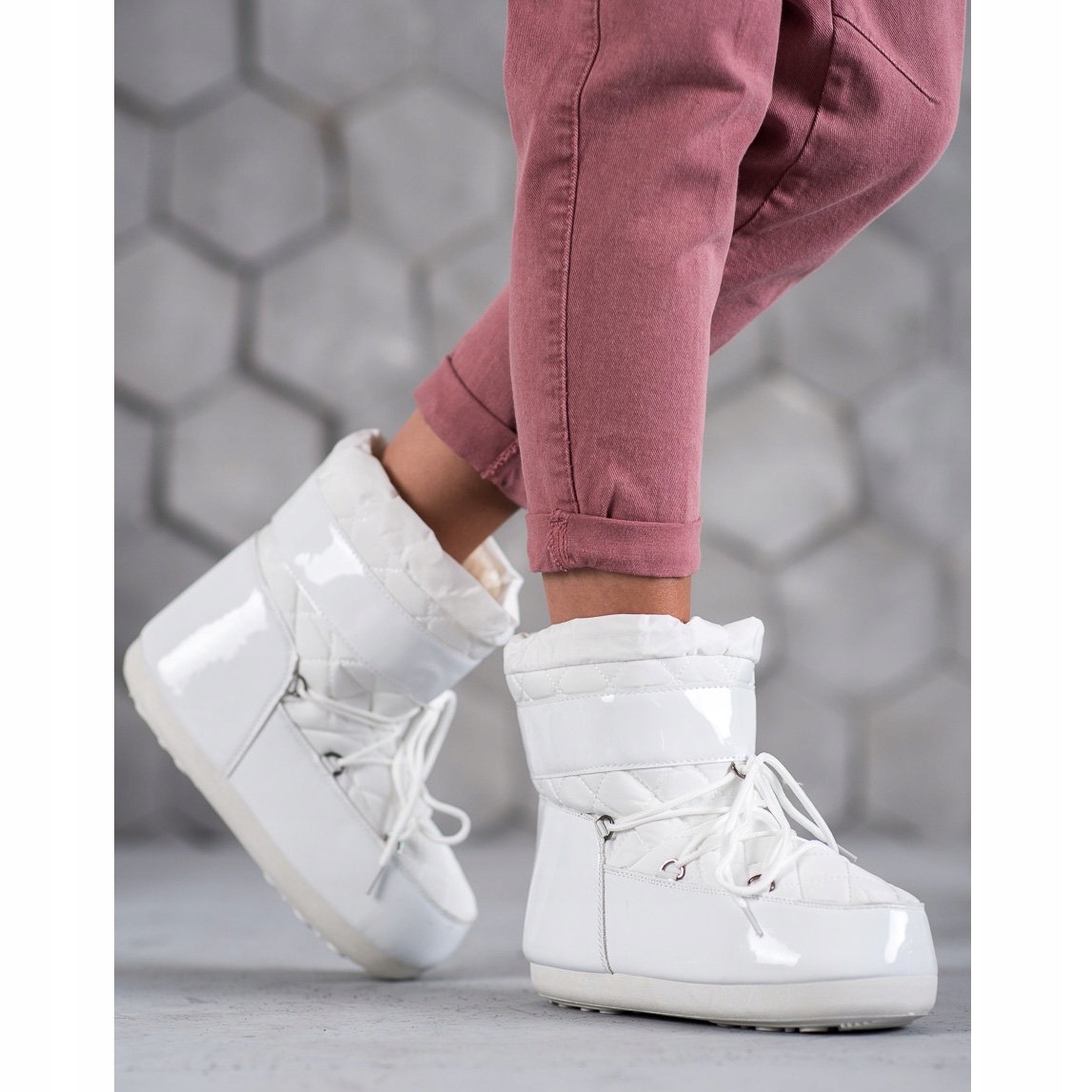 Les bottes de neige blanches sont à enfiler, ce qui permet de les enfiler rapidement et facilement : une solution parfaite pour les sorties quotidiennes. Elles sont dotées d'une semelle plate, qui assure stabilité et confort de marche, quelles que soient les conditions météorologiques. La tige haute, de 17 à 18 cm de haut, protège non seulement du froid, mais s'inscrit également dans les tendances de la mode actuelles.