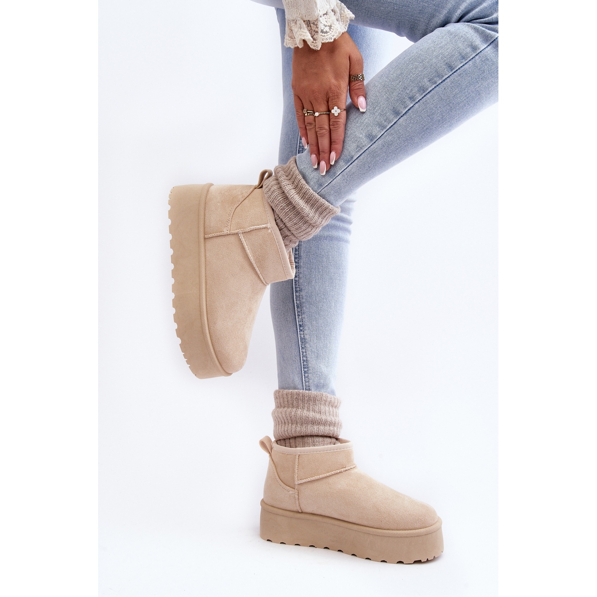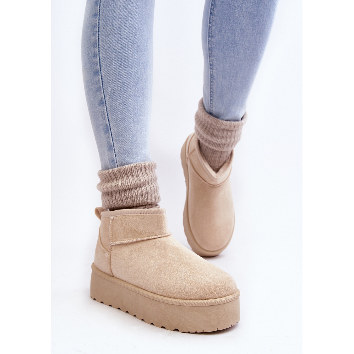 La plate-forme massive de 5 cm de haut est également significative, qui non seulement ajoute quelques centimètres de hauteur, mais vous isole surtout du froid et des surfaces inégales, garantissant stabilité et confort lors de la marche sur des surfaces enneigées ou glissantes. La plateforme, de la même couleur beige, crée un design harmonieux et uniforme.