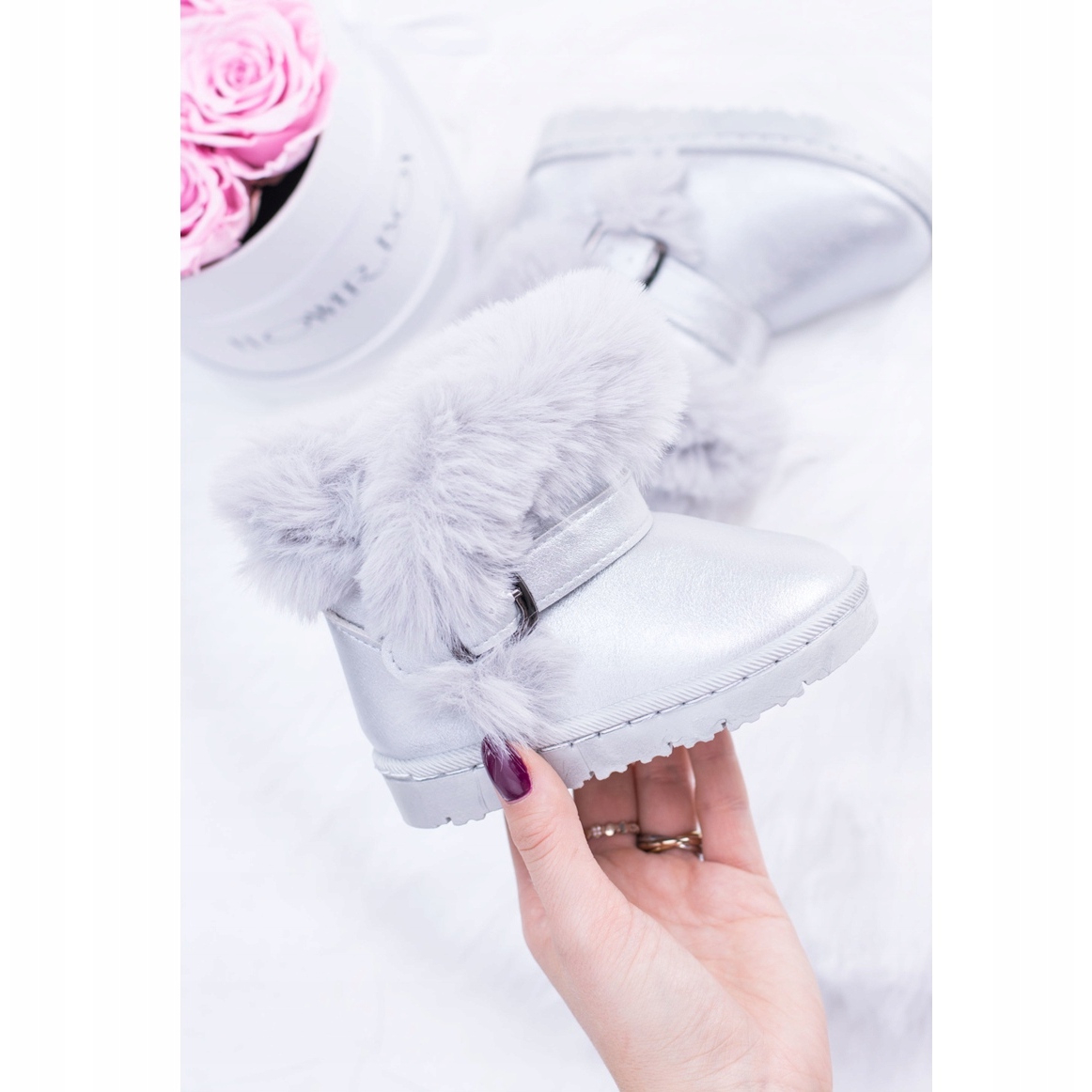 La couleur argentée des chaussures les rend non seulement pratiques, mais aussi extrêmement à la mode. La grande fourrure autour de la tige ajoute du charme et rend chaque pas confortable et chaleureux. La hauteur supérieure de 10 cm offre un soutien adéquat et la plateforme de 2 cm permet aux enfants de courir et de jouer librement.