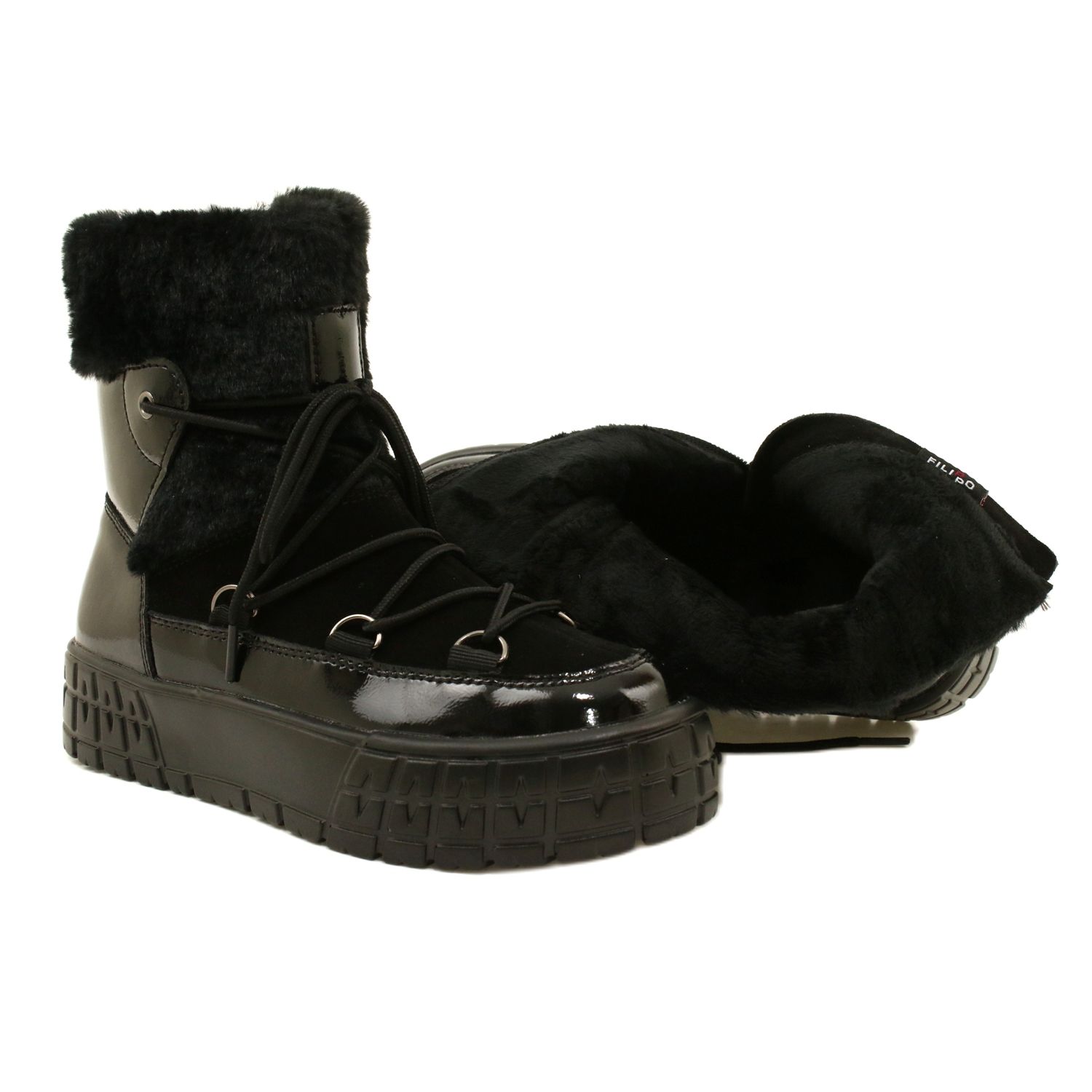 Filippo Boots élégants et pratiques en cuir peint naturel en noir profond. Papché avec une fourrure douce, avec une semelle plus élevée et un talon plat de 4 cm, ils combinent un personnage à la mode et sportif avec confort et protection contre le froid. Parfait pour les jours cool et glissants - les couleurs universelles vous font facilement les adapter aux stylisations quotidiennes et urbaines.