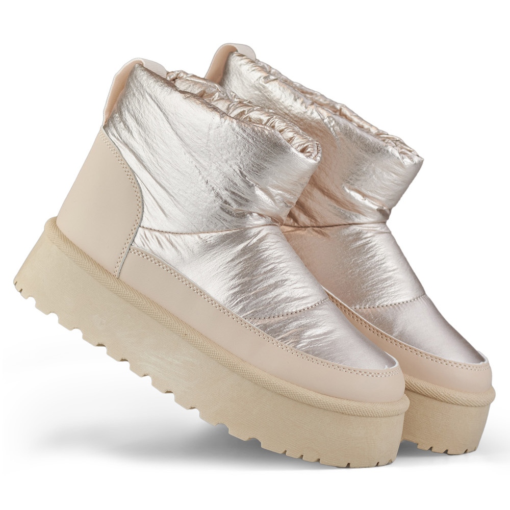 Des bottes de neige élégantes et pratiques pour femmes en matériaux synthétiques de haute qualité. La couleur beige avec des accents dorés métalliques ajoute de l'élégance et la plate-forme solide assure la stabilité et l'extension optique de la figure.