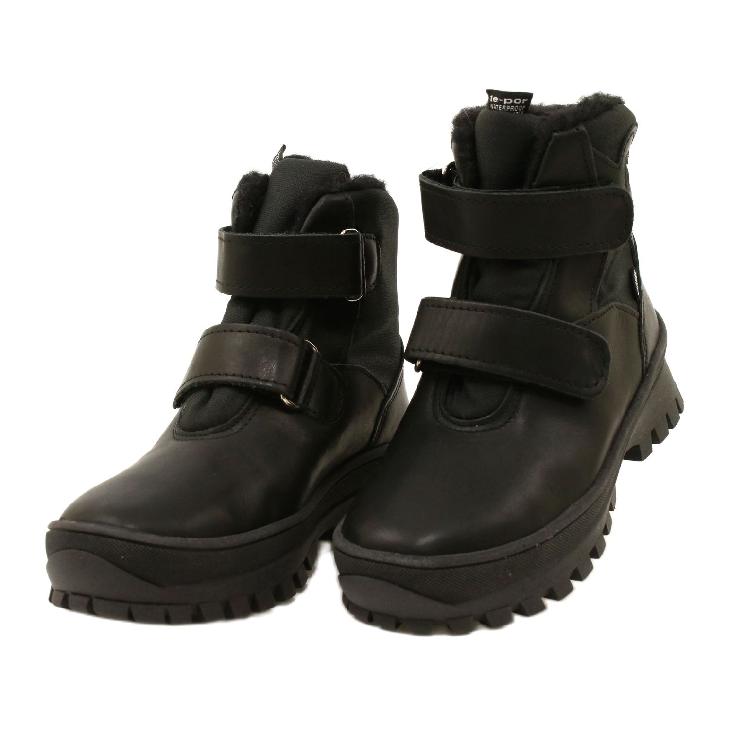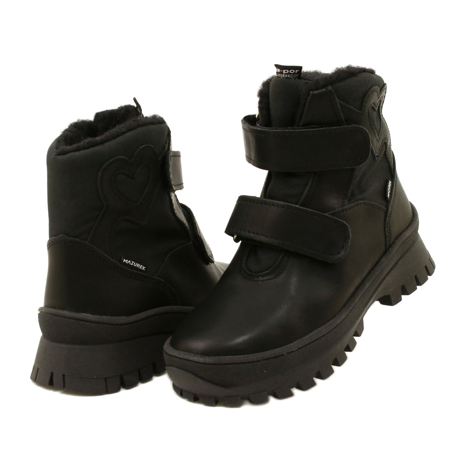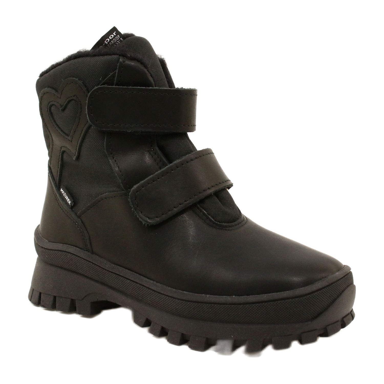 Bottes de neige élégantes et pratiques Mazurek 1351 Mélanger la fabrication solide de cuir naturel avec une membrane TE-Por imperméable, grâce à laquelle ils protègent les pieds de l'humidité lorsqu'ils jouent dans la neige et sous la pluie. La couleur noire classique avec un cœur subtil rend les chaussures belles chez les filles et les garçons.