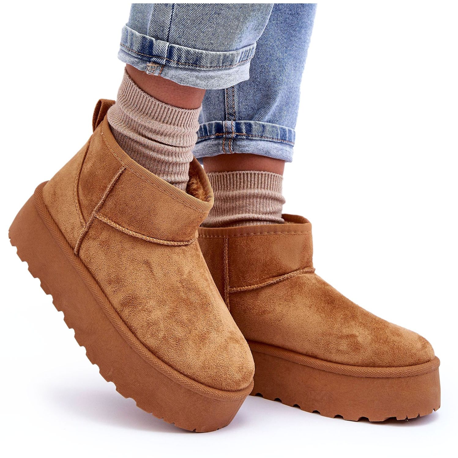 Les bottes de neige pour femmes en daim sur la plate-forme dans une couleur de chameau à la mode sont un excellent choix pour les jours froids. Fabriqués en daim eco de haute qualité, ces chaussures élégantes combinent la fonctionnalité et le style. Leur intérieur a été isolé avec une fourrure écologique et écologique, qui garantit un confort et une chaleur exceptionnels, parfaits pour les promenades d'hiver.