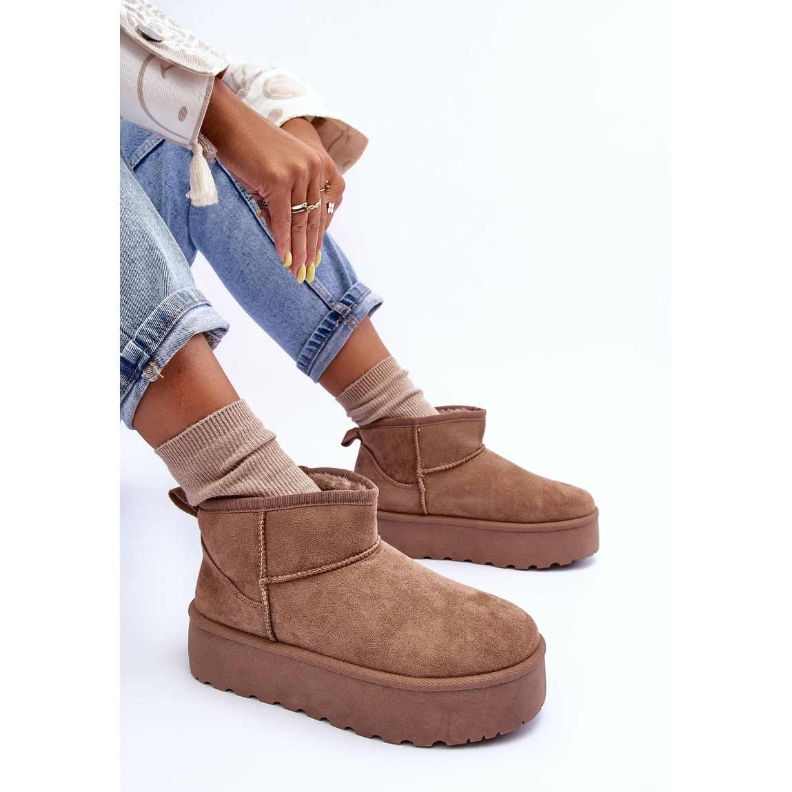 FD1 Suede Platform Snow Boots Beige foncé Corcoran en beige sont des chaussures chaudes pour femmes parfaites pour les journées d'hiver. Les bottes sont en daim écologique et leur intérieur est doublé d'une fourrure épaisse, également écologique, qui garantit la chaleur. La hauteur du talon / de la plateforme est de 5 cm, ce qui isole en outre les pieds du sol froid. Les bottes mesurent 9 cm de haut avec une tige de 13 cm de large.
