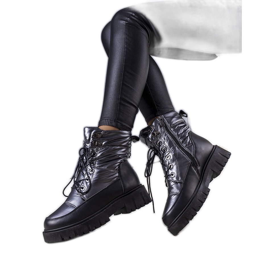 Des bottes de neige pratiques et à la mode, créées pour des promenades et des voyages plus longs de la ville. Le haut en cuir écologique de haute qualité combiné avec des inserts de matériaux garantit le confort et la durabilité, et la fourrure douce et chaude à l'intérieur assure un réchauffement agréable même les jours glaciaux. La teinte du fabricant "Piter" est une variante de graphite et noire avec un université noir et facile à styliser.