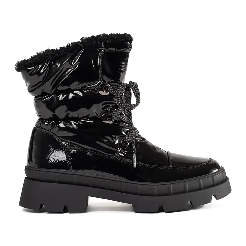 Les bottes de neige noires se caractérisent par un talon plat de 5 cm et une hauteur de tige de 14 à 15 cm, ce qui leur permet de parfaitement protéger les jambes du froid. Grâce à la semelle crantée en plastique, les chaussures offrent stabilité et traction sur diverses surfaces.