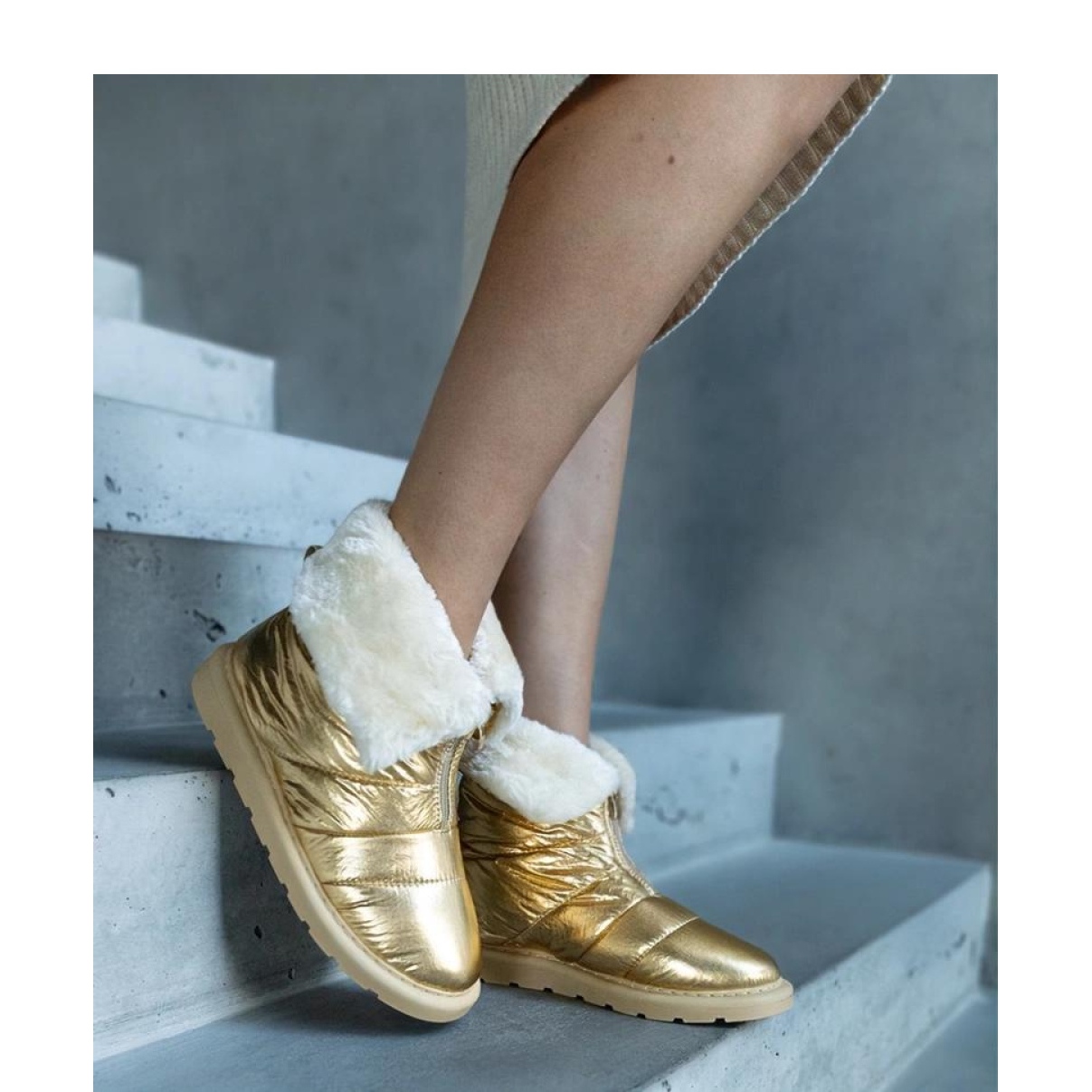 L'intérieur chaud de ces bottes de neige garantit que même les jours les plus froids, vos pieds seront agréablement chauffés. La fixation de fermeture éclair facilite la mise en place et les chaussures rapidement, ce qui est extrêmement important dans un usage quotidien. La couleur dorée du tissu extérieur et la semelle beige en caoutchouc ajoutent une élégance et un caractère moderne.