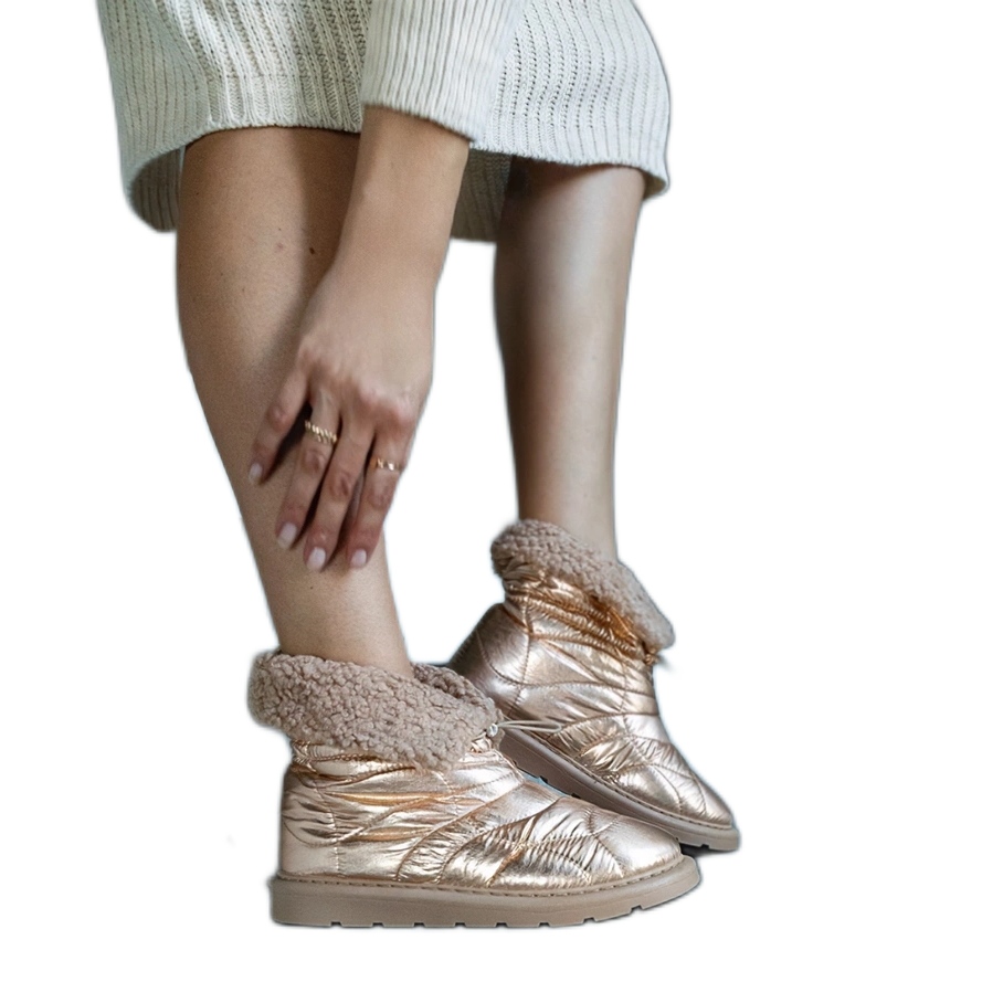 Des bottes de neige à isolation dorée avec une manchette Caellita en champagne pour avoir indispensable dans chaque garde-robe d'hiver! Ces chaussures élégantes et hautes combinent parfaitement le design à la mode avec les fonctionnalités, ce qui en fait un choix idéal pour les femmes qui veulent se sentir élégantes même les jours les plus froids.