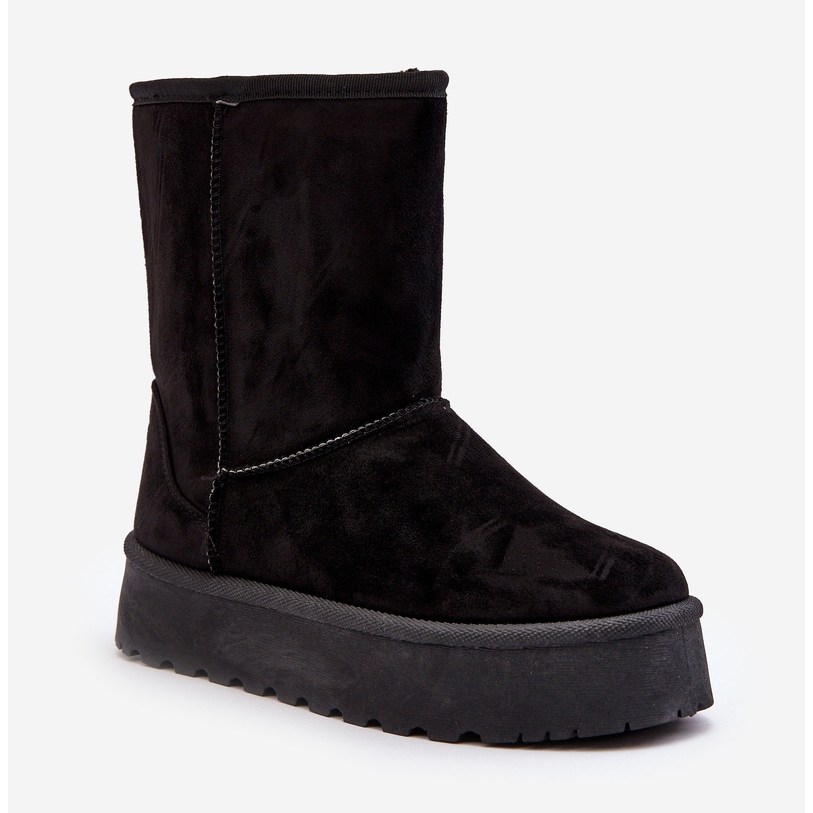 PS1 Bottes de neige pour femmes - Chaussures chaudes, élégantes et confortables pour les jours froids. Modèle glissé en cuir en daim écologique en noir classique, avec une fourrure épaisse au milieu, qui offre un confort thermique même à basse température. Pour la cheville (hauteur de la partie supérieure d'environ 19 cm), avec un caoutchouc, une semelle sans glissement et une plate-forme délicate (environ 4-4,5 cm), grâce à laquelle les chaussures sont parfaitement isolées du sol froid et sont stables lorsqu'ils marchent.