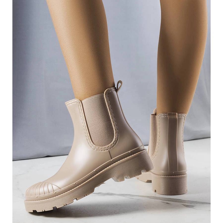 Une proposition courte et élégante pour les jours de pluie - des bottes en caoutchouc beige en caoutchouc de haute qualité avec des inserts flexibles qui facilitent le fait. Une coupe classique et lisse avec un nez rond et une fixation coulissante fonctionnera à la fois dans les stylisations urbaines et pendant les promenades.