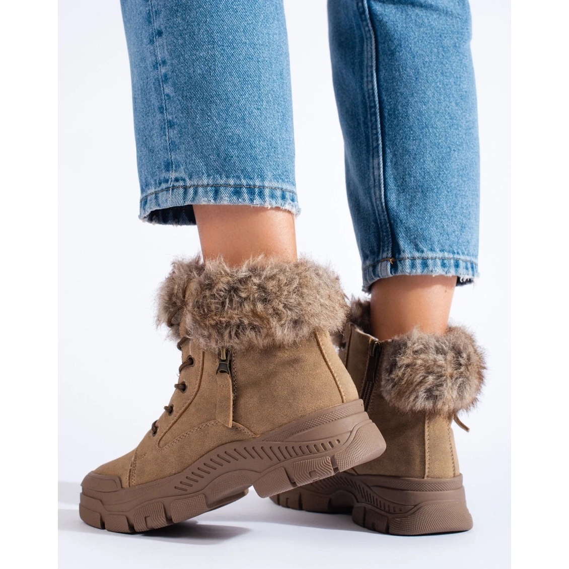 Les trappeurs pratiques en cuir écologique de haute qualité dans une teinte beige chaude. Papché avec de la fourrure douce (insert en peau de mouton) et une doublure textile, avec une semelle solide avec une bande de roulement - idéale pour les stylisations quotidiennes, décontractées et sportives les jours plus frais.
