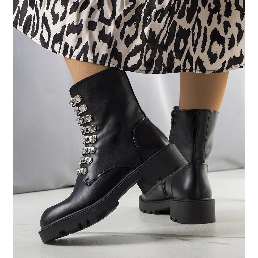 Les trappeurs noirs avec des chaînes Sylas - des bottes élégantes et pratiques idéales pour la saison automne / hiver. La combinaison de trappeur brut avec un accent métallique à la mode sous la forme de chaînes signifie que le modèle se démarque dans les stylisations quotidiennes et plus rock.