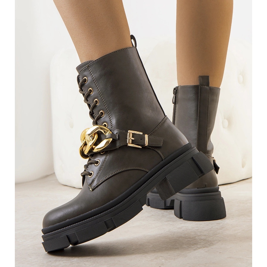 Les trappeurs verts avec la chaîne Iversen - des bottes qui changeront toute stylisation hivernale. La combinaison d'une teinte à la mode militaire-vert avec une chaîne dorée spectaculaire et des détails fait que le modèle LM-08 a la saison automne / hiver.