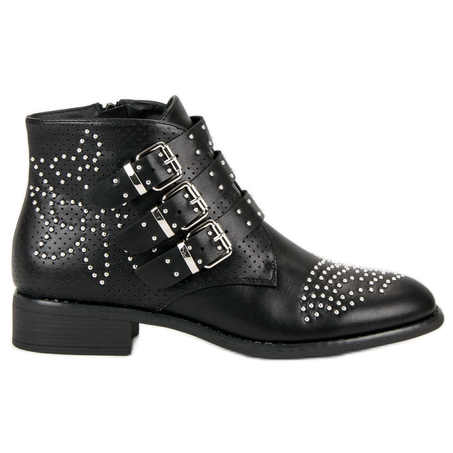 Les bottines se caractérisent par des strass et un motif ajouré qui leur confèrent un caractère rock, et trois boucles lumineuses ajoutent modernité et élégance. Avec une hauteur de talon de 3,5 cm et un bout plat, ces bottines sont confortables à porter toute la journée.