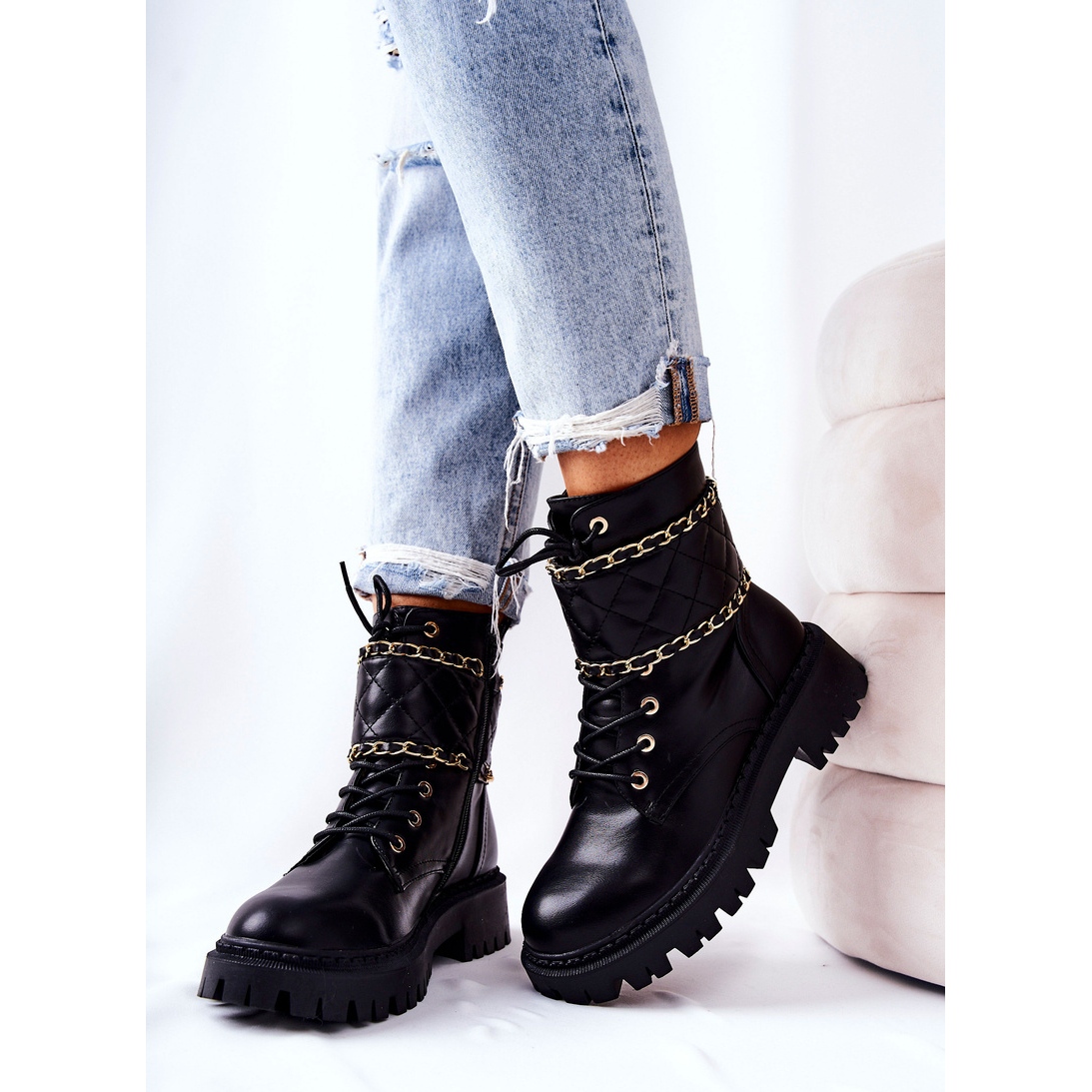 Élégants, durables et confortables - les bottes de travail de Caleanor sont une proposition pour les femmes qui apprécient chaque jour l'apparence à la mode et le réconfort. Fabriqué en cuir écologique de haute qualité, isolé avec une couverture de chaussures douces, ils sont parfaits en automne et en hiver. Une sangle matelassée avec une chaîne décorative donne du caractère. Modèle fixé avec une fermeture éclair et en plus lié, ce qui le rend plus facile à s'adapter.