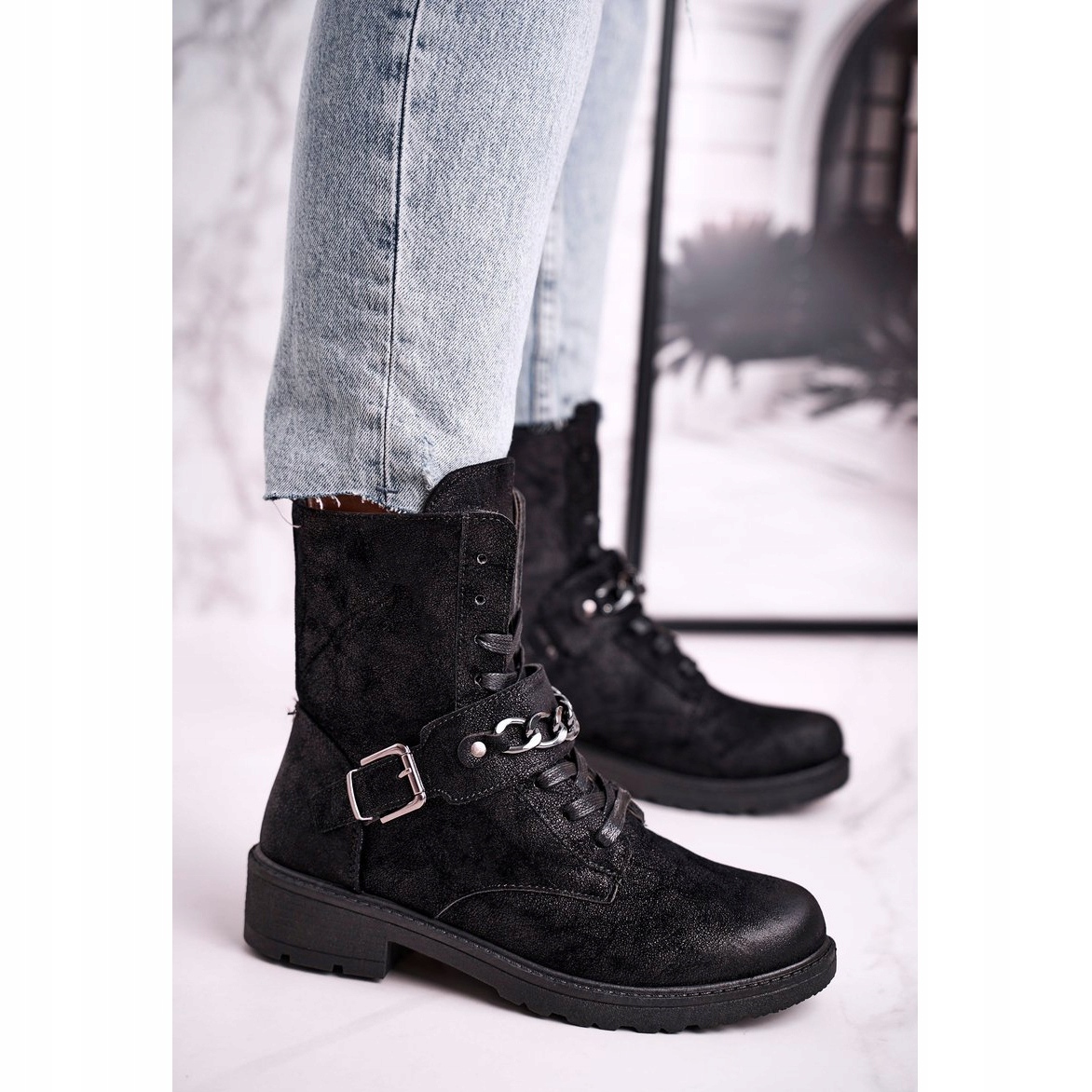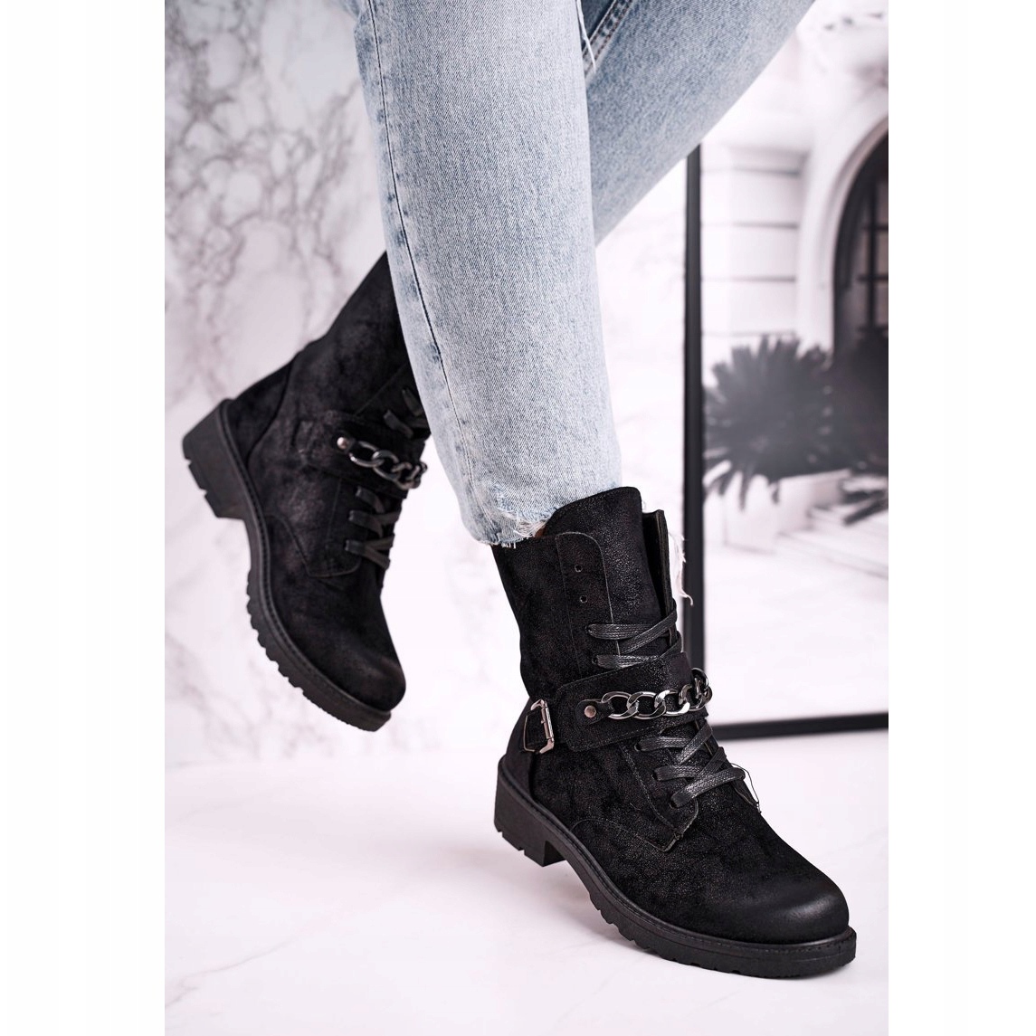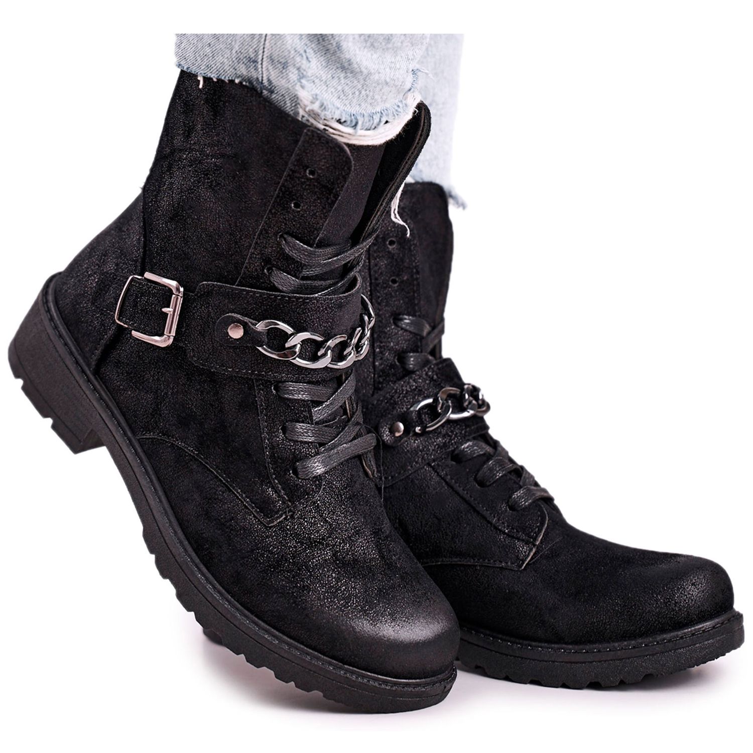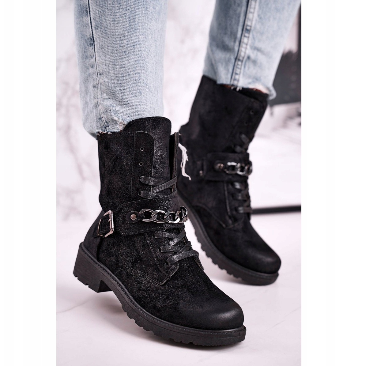 Les bottes de travail en daim Augusta noires avec chaîne sont un choix parfait pour les femmes qui apprécient non seulement le style, mais aussi le confort. Ces bottines uniques en éco-daim combinent un design classique avec des accents modernes, grâce à une chaîne décorative en argent qui leur donne un caractère unique.