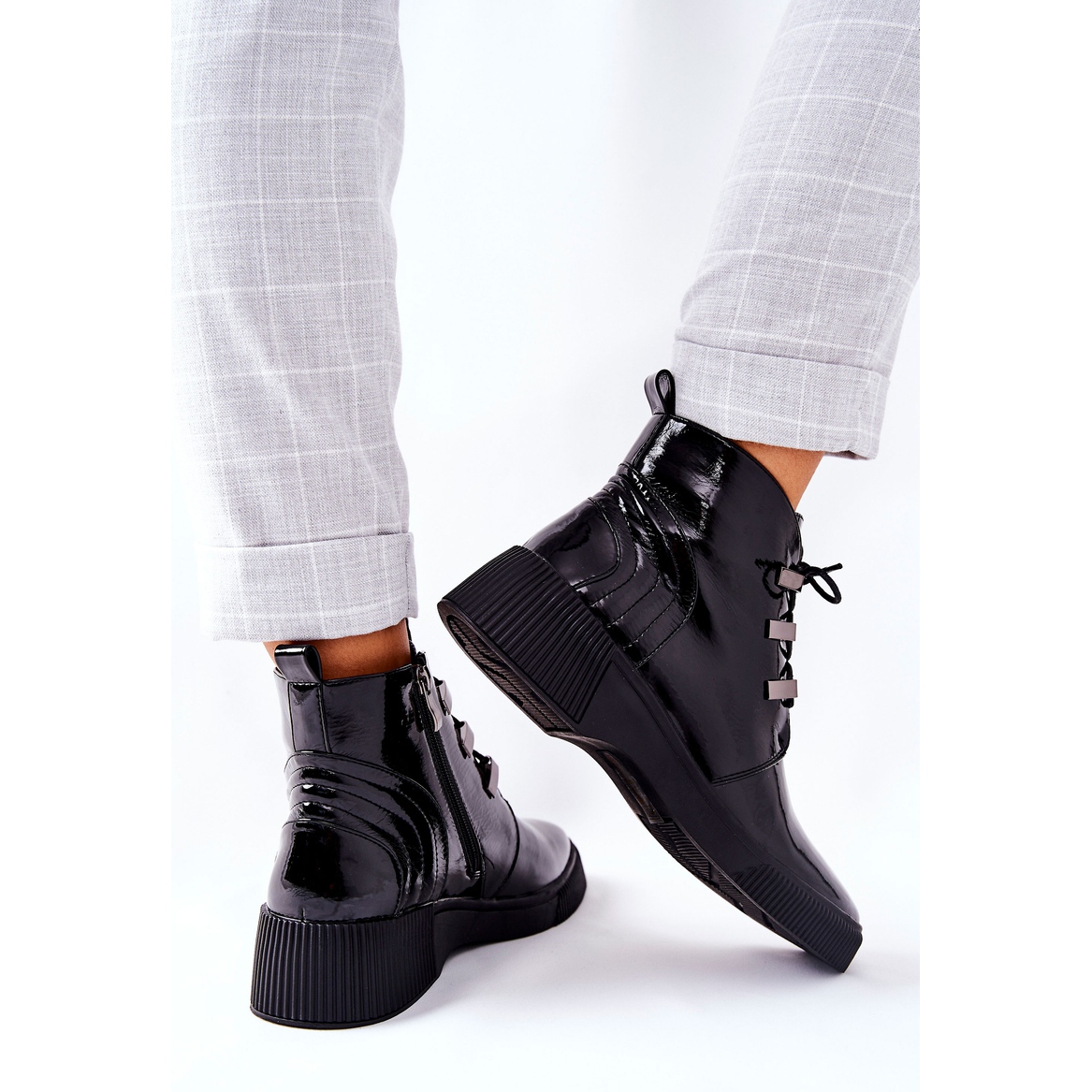 Une fermeture éclair pratique située sur le côté de la tige permet un enfilage rapide et facile des chaussures, tandis que les détails métalliques sur le laçage ajoutent du caractère et une expression moderne. L'intérieur des bottes est isolé avec une fourrure délicate, qui assure confort et chaleur même pendant les jours les plus froids.