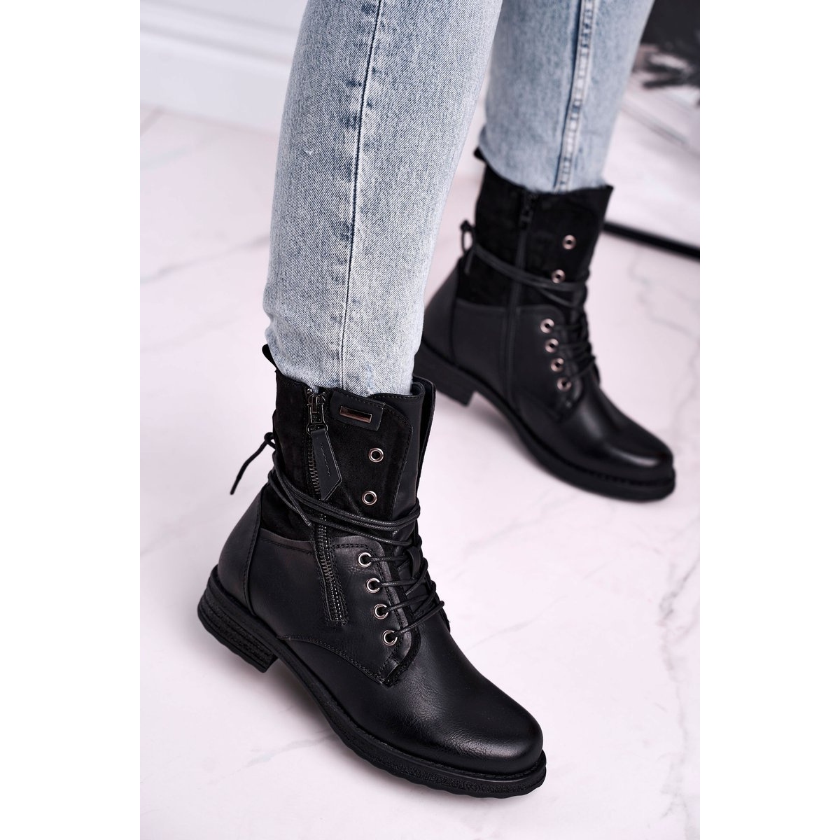 Êtes-vous à la recherche de bottes universelles qui fonctionneront dans les stylisations quotidiennes et plus rock? Ces travailleurs noirs sont la combinaison parfaite de caractère urbain et de fonctionnalité. Le haut en cuir écologique va bien avec un jean, une jupe ou une robe, et l'isolation sous la forme d'une couverture de chaussures douces assurera le confort même les jours plus frais.