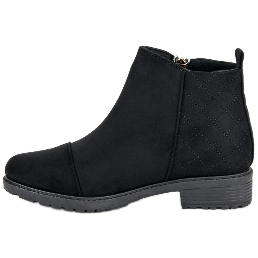 La fermeture éclair, située sur le côté, facilite l'achat et le retrait des chaussures, ce qui est particulièrement apprécié au quotidien. Les bottines noires se distinguent par leur style unique grâce à un matelassage et une fermeture éclair dorée, alliant féminité et modernité. L'intérieur des bottes assure le confort et la semelle flexible isole bien des irrégularités du sol, ce qui augmente le confort de port.