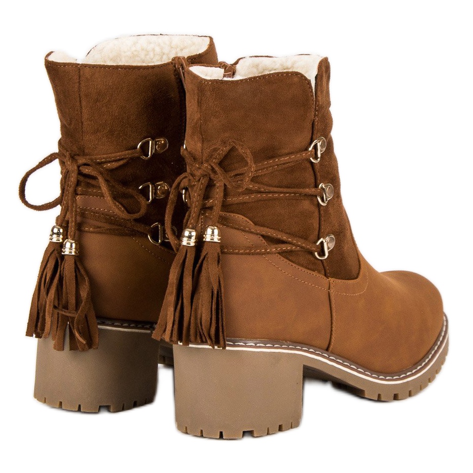 Les bottes ont un talon confortable, fermé et rigidifié, qui assure un confort de port tout au long de la journée. Leur semelle à crantage en plastique garantit la stabilité, et un talon plat de 5,5 cm de hauteur ajoute un chic subtil. Un détail intéressant sont les franges, qui donnent aux chaussures un caractère unique et attirent l'attention des passants.