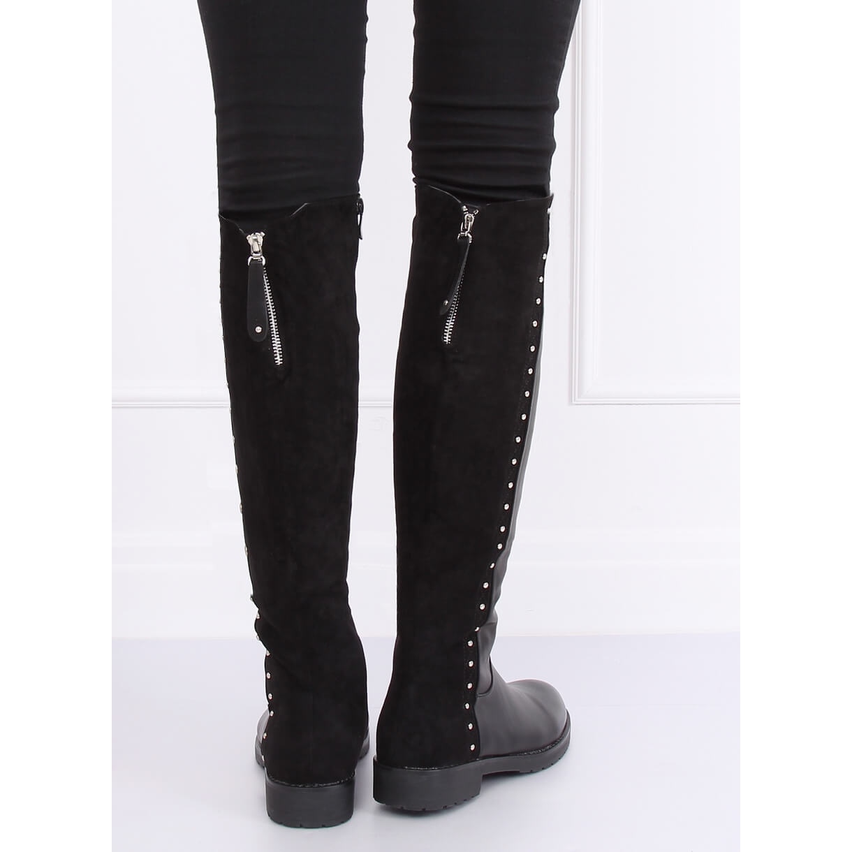 Leur couleur noire classique les rend parfaitement assortis à différents styles, du plus décontracté au plus élégant. La tige haute arrivant jusqu'au genou, ornée de clous et de strass accrocheurs, confère aux chaussures un caractère distinctif et les distingue des autres.