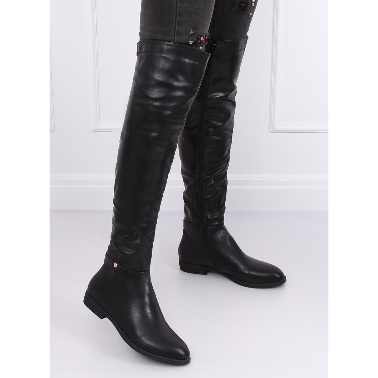 Les bottes mousquetaires noires pleine fleur 1943-50A Black sont un modèle unique qui allie l'élégance avec un peu de style militaire. Ces bottines pour femme, réalisées en cuir écologique brillant de haute qualité, attirent l'attention par leur tige unique arrivant au-dessus du genou, qui affine parfaitement la silhouette.