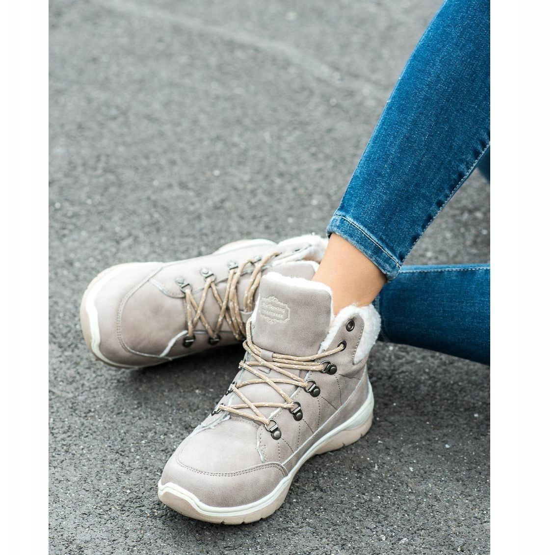 La partie extérieure des chaussures est en cuir suédé écologique dans une délicate teinte gris clair, ce qui leur donne un aspect élégant et à la mode. Les coutures décoratives et le laçage à l'arrière du pied ajoutent du caractère et assurent un ajustement parfait au pied.