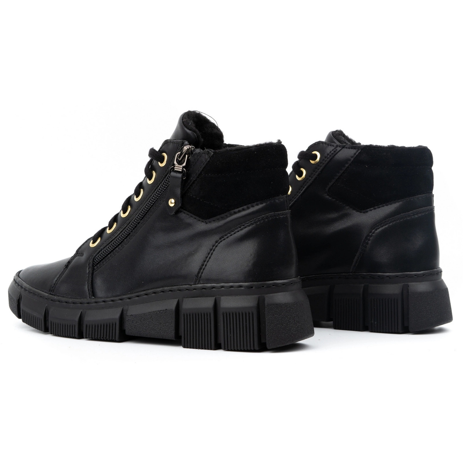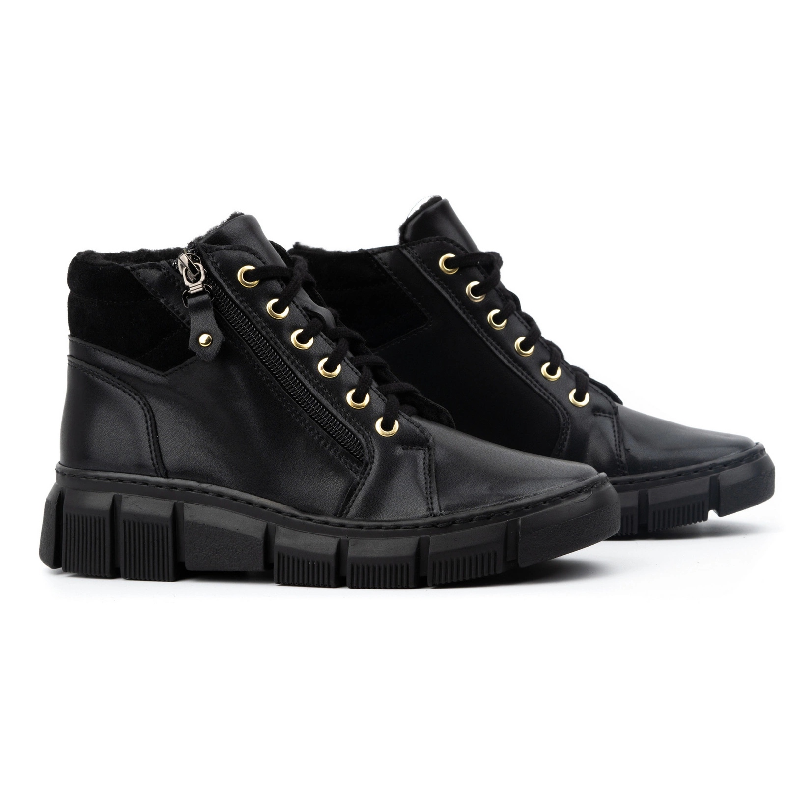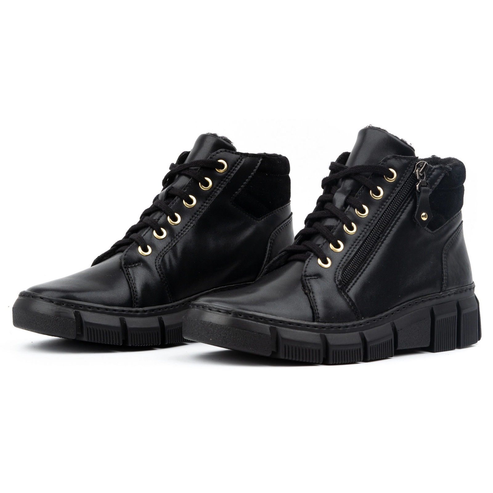 Ces bottes élégantes sont caractérisées par un nez rond et une fermeture éclair pratique et une attache à lacs, ce qui le rend plus facile à mettre. La hauteur du talon de 3 cm et la plate-forme assurent la stabilité et le confort du port, idéal pour les sorties quotidiennes. Le réchauffement de la peau de mouton garantit la chaleur même les jours les plus froids, et une semelle solide en plastique à haute qualité les rend résistants aux surfaces glissantes.