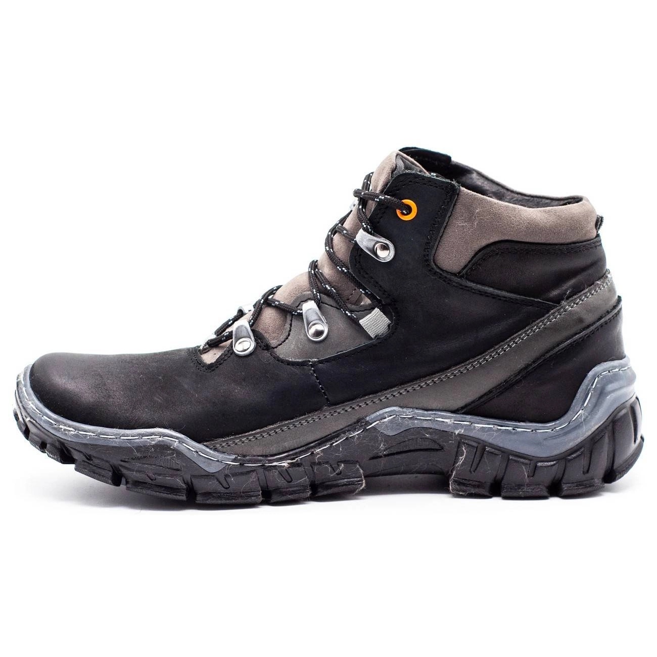 Chaussures d'hiver classiques et solides pour les hommes à la recherche de confort et de durabilité. Ils atteignent la cheville, ont une isolation de la laine naturelle, grâce à laquelle ils offrent un confort thermique les jours plus frais. La partie supérieure en cuir naturel en noir élégant avec des accents gris discrets, finis avec des boucles de ceinture argentées et un laçage classique. La semelle en plastique récupérée et haute qualité garantit une certaine étape sur les surfaces glissantes.