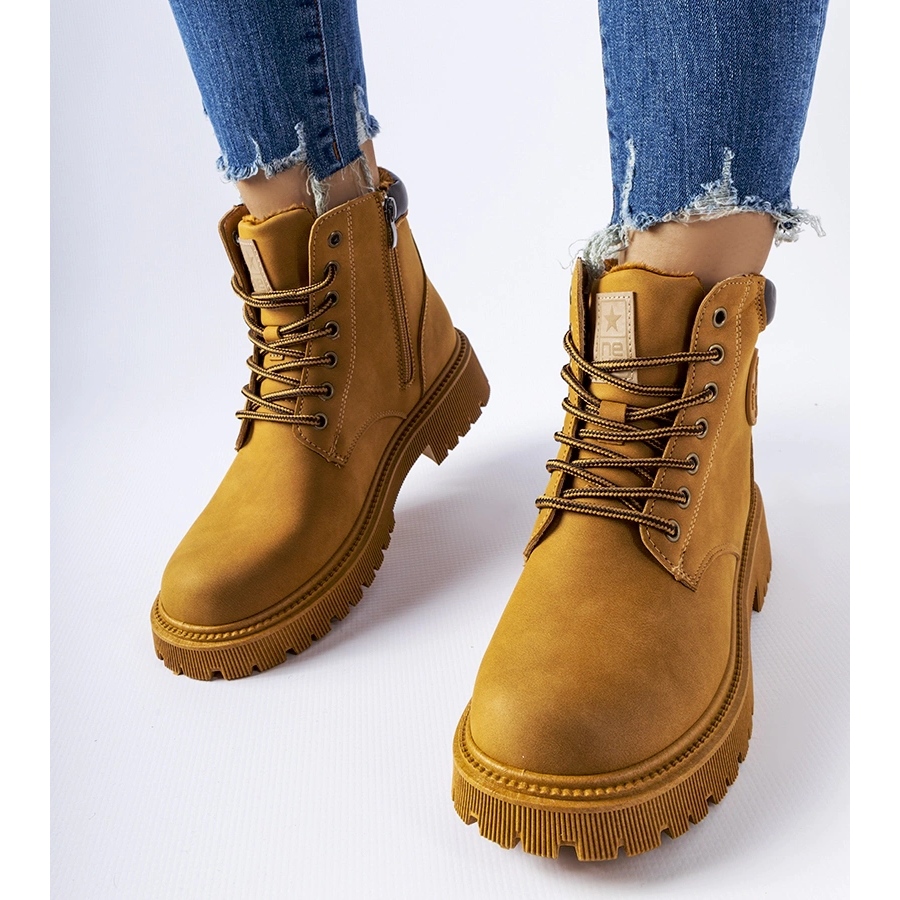 Le produit décrit est des bottes pour femmes Doutor de couleur marron, ou camel, comme l'appelle le fabricant. Ce sont des chaussures isolées, ce qui les rend parfaites pour les journées froides. Ils assurent un confort thermique, protégeant vos pieds du froid. Ils sont fabriqués en cuir écologique, ce qui garantit leur durabilité et leur résistance à l'humidité. Les bottes trappeur ont un bout arrondi, ce qui leur donne du charme et épouse bien la forme du pied.