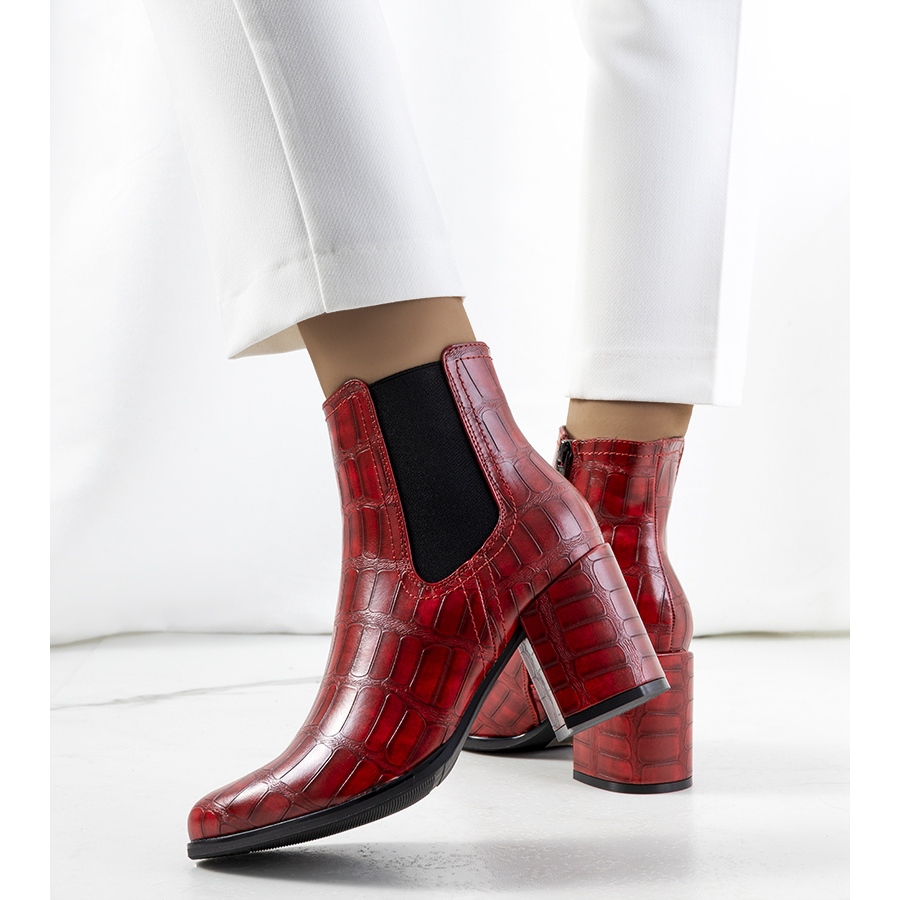 La couleur rouge, associée au gaufrage imitant la peau de crocodile, leur confère un caractère unique qui attirera certainement l'attention. Posés sur un poteau de hauteur moyenne, soit 7 cm de haut, ils offrent stabilité et confort, ce qui en fait un choix idéal pour un usage quotidien et pour les occasions spéciales. Les bottines jusqu'aux chevilles se marient parfaitement avec de nombreux styles d'automne - des pantalons classiques aux robes en passant par les jupes.