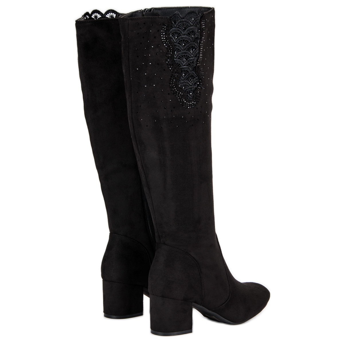 Les bottes noires se caractérisent par une tige joliment décorée, qui attire l'attention avec une dentelle subtile sur le dessus, complétée par de délicats cristaux. Ce détail leur confère un charme et une sophistication uniques, ce qui en fait un choix idéal pour les occasions spéciales pour les femmes qui apprécient le bon goût et le style à la mode.