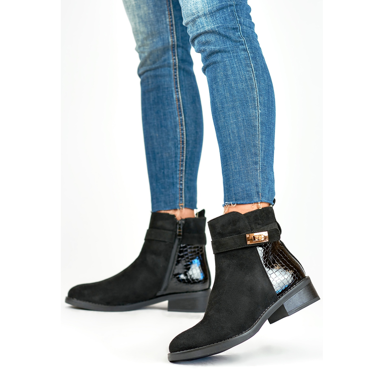 Des bottes féminines élégantes sur une semelle plate - noir, intemporel et confortable. La combinaison du daim écologique et du cuir écologique verni leur donne un aspect sophistiqué et multidimensionnel: le supérieur mat contraste avec un accent subtil et brillant. Un motif d'animal délicat ajoute du caractère, sans écraser l'ensemble.