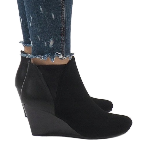 Découvrez l'élégance et le confort avec les bottines compensées 1455 de couleur noire classique. Ces chaussures de mode pour femmes sont fabriquées en éco-daim noir de haute qualité, ce qui les rend non seulement élégantes, mais également respectueuses de l'environnement. Leur silhouette élancée affine les jambes et la cale de 8 cm de hauteur assure confort et stabilité à chaque pas.