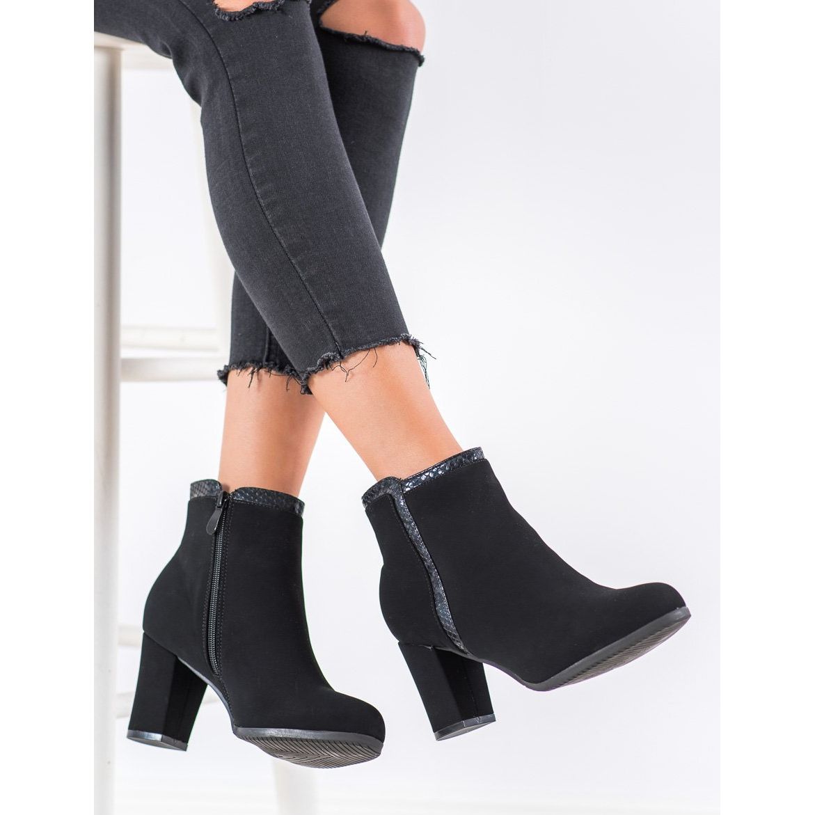 Les bottines élégantes Weide en noir sont un choix élégant pour les femmes qui apprécient la mode et le confort. Fabriqués en cuir écologique suédé noir de haute qualité, ils combinent un look moderne avec des éléments classiques. Grâce au talon bloc de 7,5 cm de haut, ils offrent stabilité et confort au quotidien, tout en ajoutant de l'élégance à n'importe quel style.