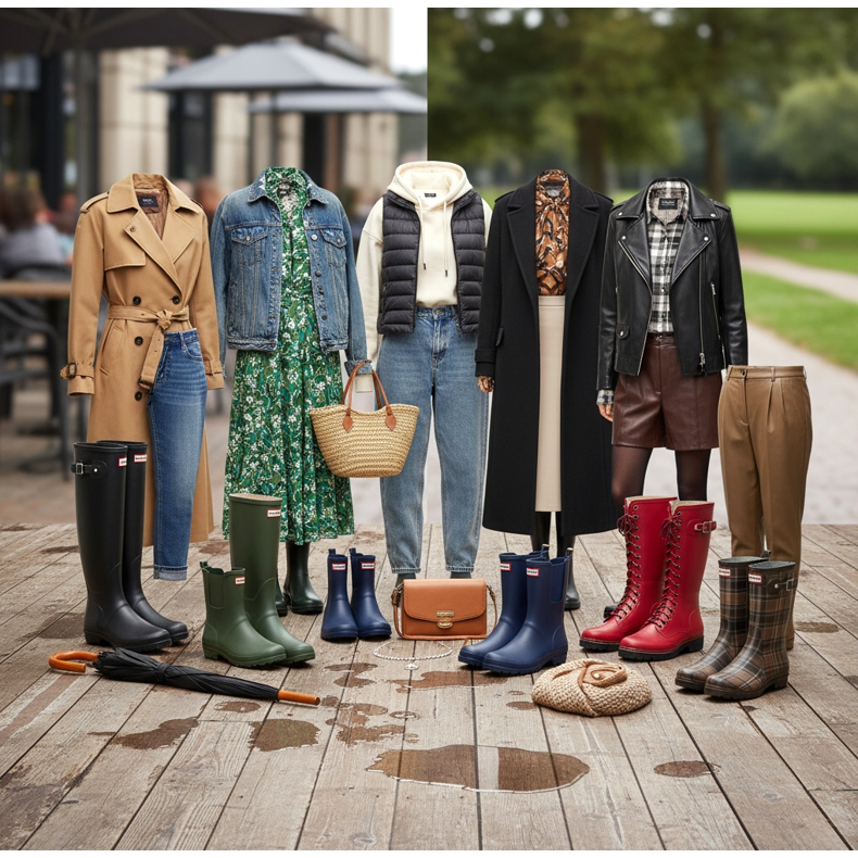 Chic urbain – des bottes en caoutchouc Hunter noires classiques associées à un trench-coat ajusté, un jean skinny et un pull en cachemire. Ajoutez un sac à main en cuir et un parapluie élégant - une tenue prête pour un jour de pluie en ville.