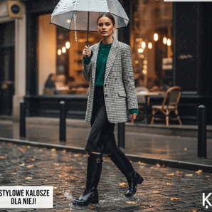 L'élégance sous la pluie – des bottes Wellington noires avec une jupe crayon, un chemisier en soie et un manteau classique. Un look professionnel qui fonctionnera même au bureau.
