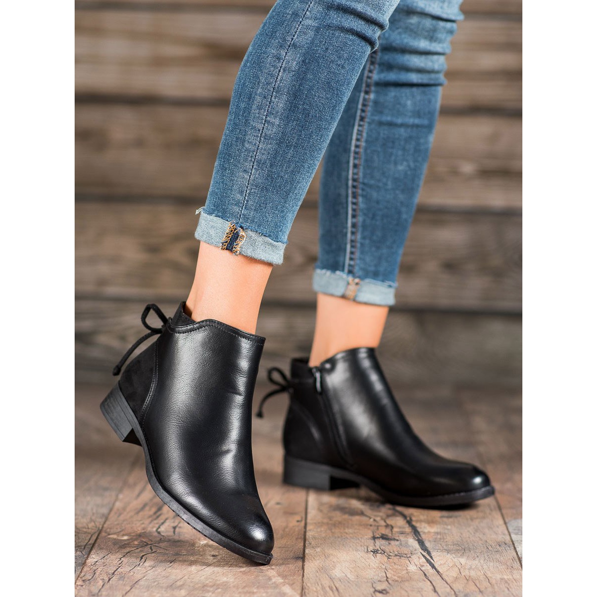 Fabriquées en cuir écologique de haute qualité, ces bottes garantissent un confort de port grâce à un talon haut large et stable de 3 cm. C'est une solution idéale pour les personnes qui apprécient le confort lors de longues promenades. La tige de couleur noire universelle est ornée d'une finition en daim à l'arrière et d'un joli nœud, qui leur confère un charme unique.