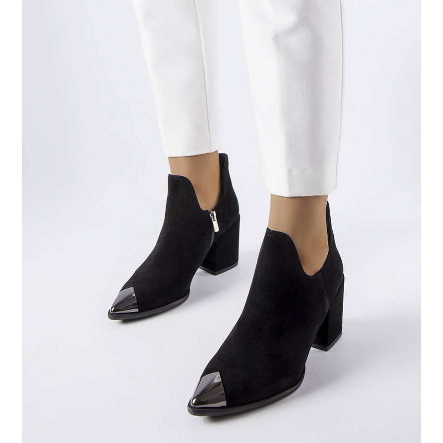 Bottes Karino en cuir noir - Élégant, confortable et prêt pour les défis quotidiens. Fabriqué en cuir en daim naturel, ils atteignent la cheville et présentent un élégant cowboy coupé avec un nez pointu moderne décoré d'un insert en métal argenté. Le talon de type à thèmes bas avec une hauteur de 7 cm assure la stabilité et la silhouette féminine, et la fermeture éclair à l'intérieur le rend plus facile à mettre.