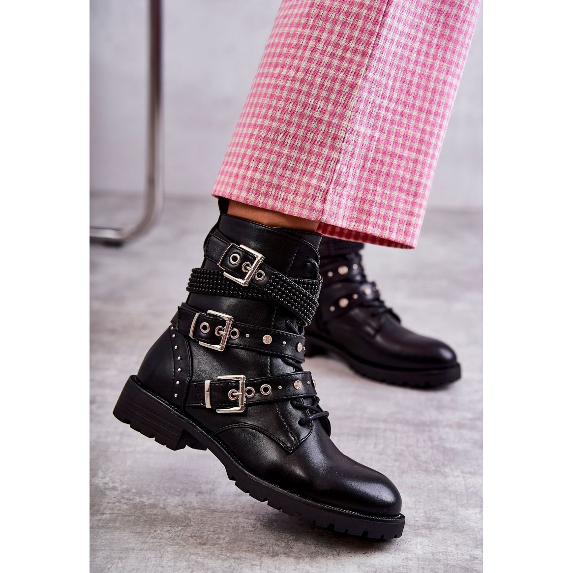 Plongez dans l'univers de la mode avec les élégantes bottines PG1 qui allient parfaitement style et confort. Fabriquées en éco-cuir résistant, ces bottines noires se distinguent par des rayures décoratives avec des strass qui leur confèrent un caractère unique. Ce modèle est non seulement esthétique, mais aussi fonctionnel : des brides réglables avec boucles permettent un ajustement parfait à votre pied.