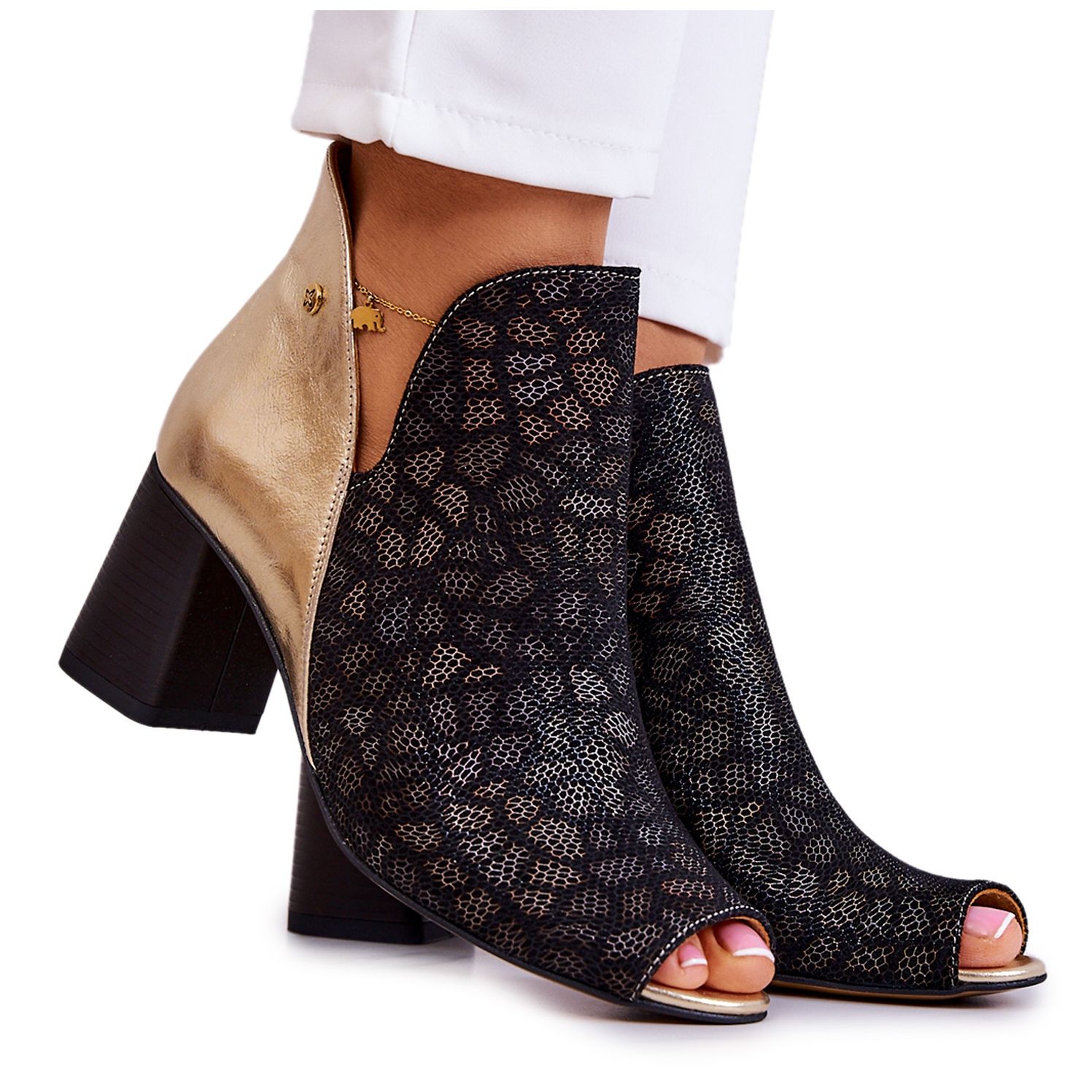 La largeur de la tige de 11 cm et sa hauteur de 9,5 cm s'adaptent parfaitement aux jambes, et l'utilisation d'une fermeture éclair sur le côté de la tige rend l'enfilage des chaussures extrêmement facile. Les bouts ouverts ajoutent légèreté et modernité, et les couleurs noir et or rendent les bottes polyvalentes et faciles à combiner avec différents styles.