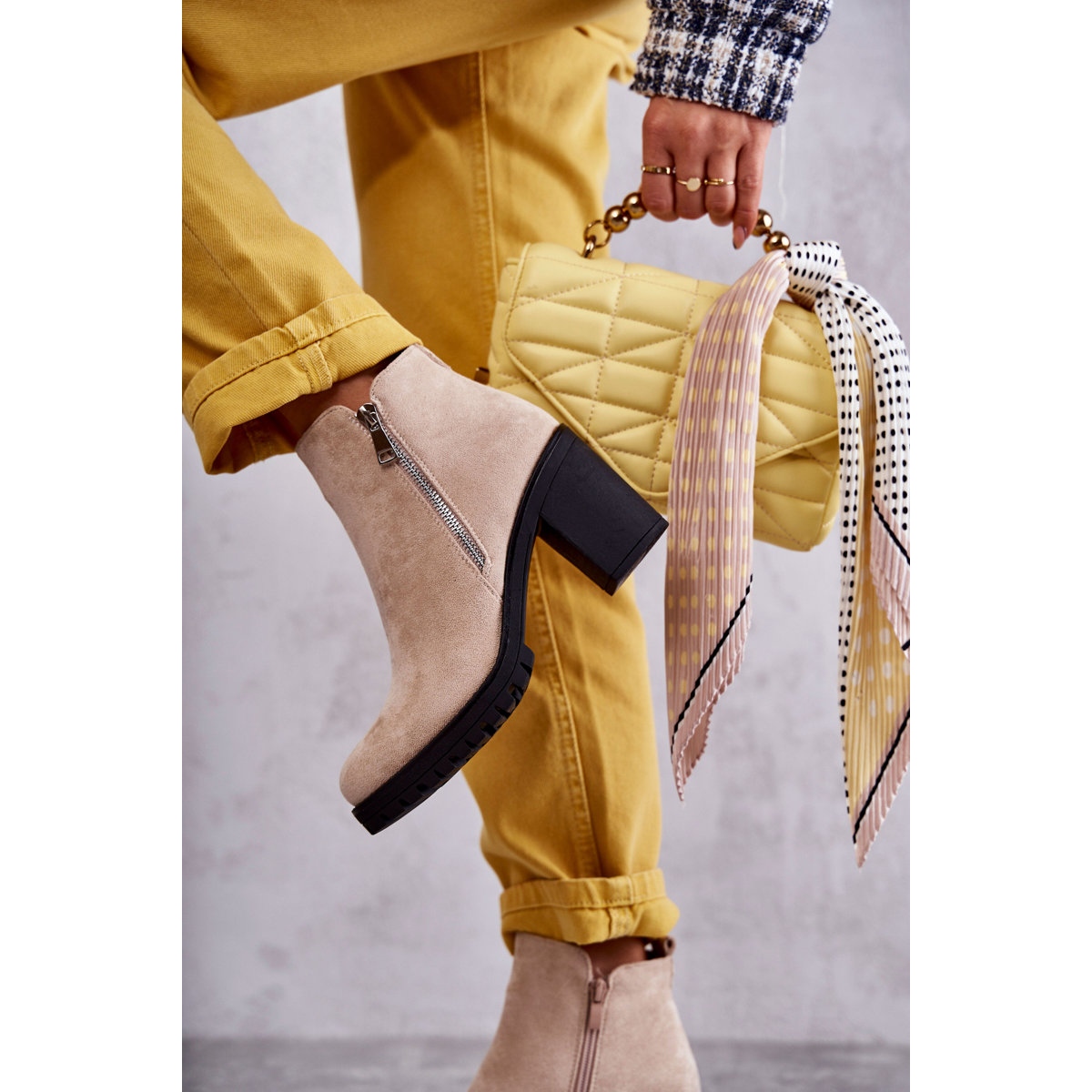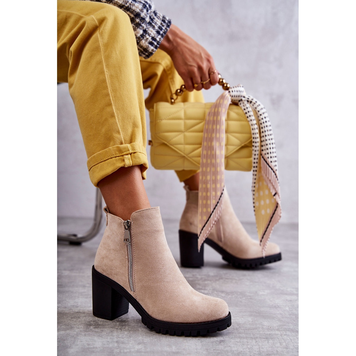Ce sont des bottines à talons hauts beige clair élégantes et stylées de la marque PG1, qui compléteront certainement n'importe quel style d'automne. Fabriquées en éco-daim, ces bottines classiques se caractérisent par une tige jusqu'aux chevilles et deux fermetures éclair pratiques sur les côtés. L'un d'eux est décoratif et l'autre permet d'enfiler et d'enlever facilement les chaussures.